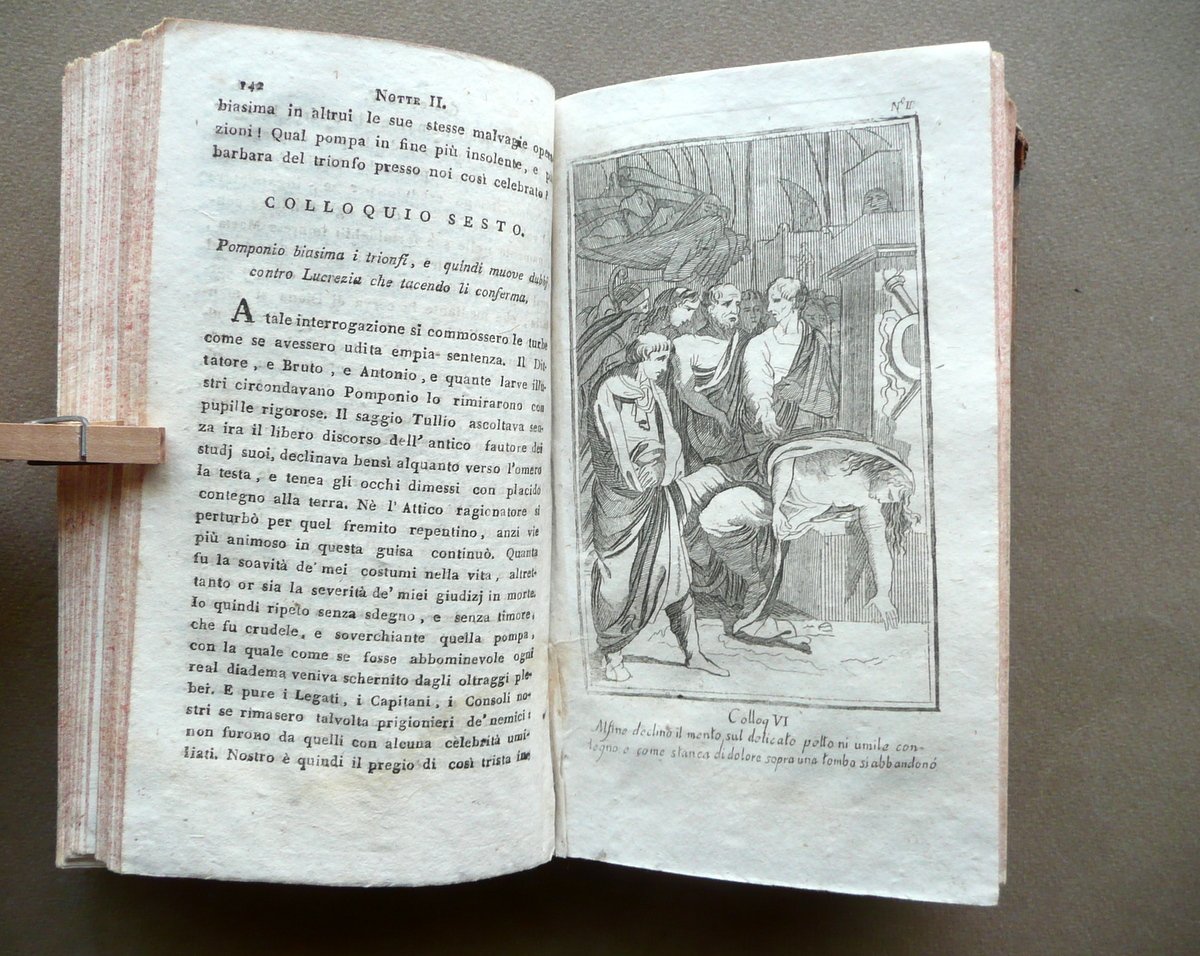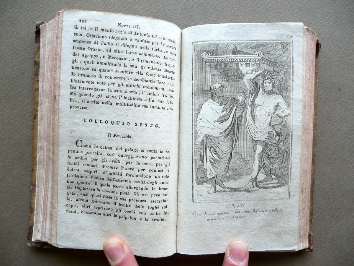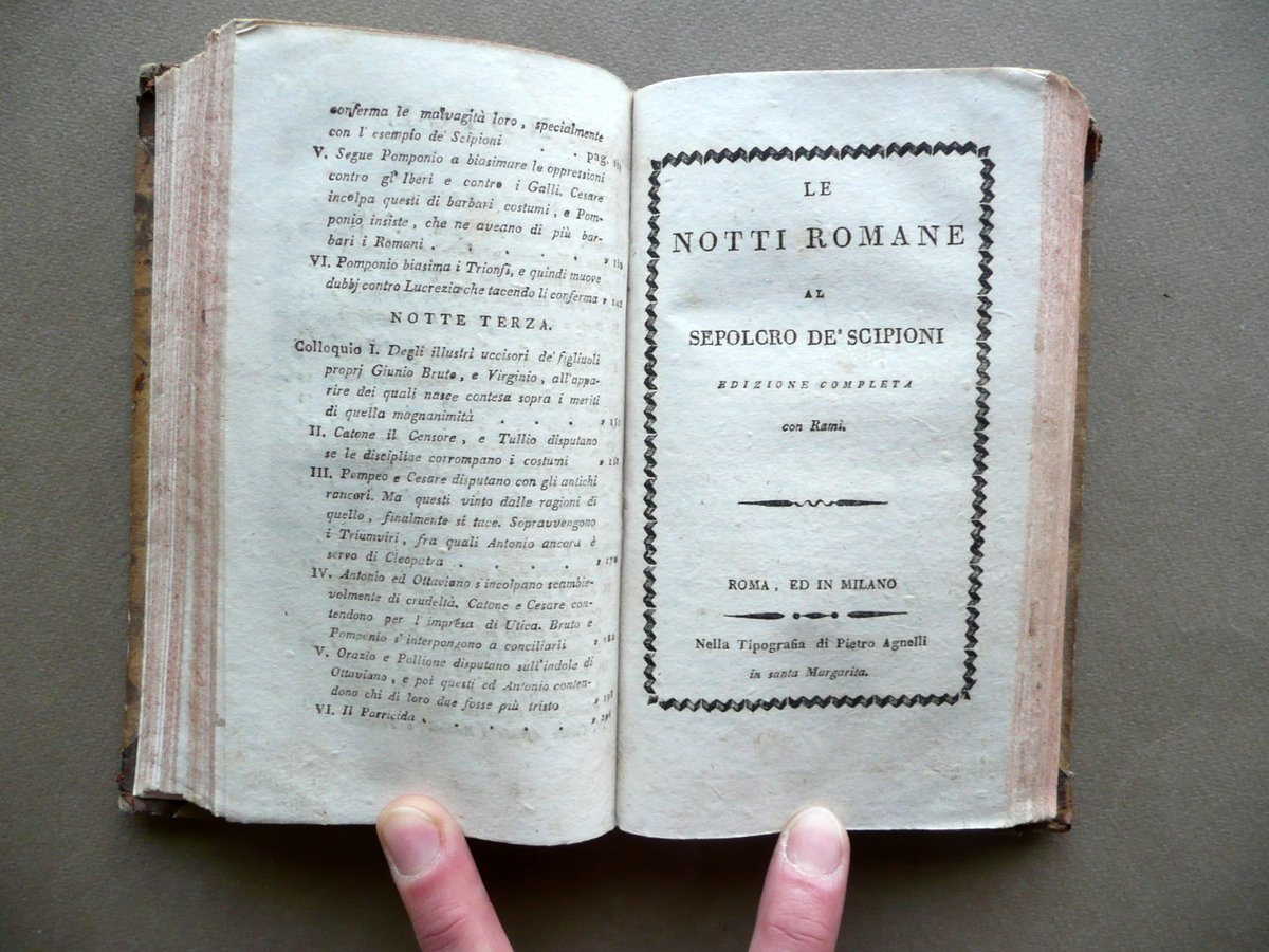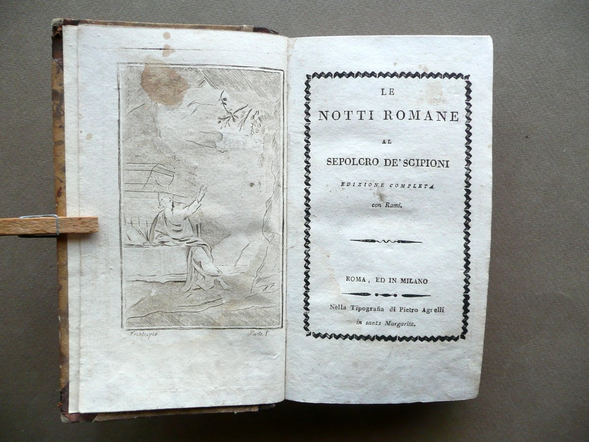 Alessandro Verri, Le Notti Romane Al Sepolcro degli Scipioni Edizione completa Con rami (opera completa in due volumi) Nella Tipografia di Pietro Agrelli, Milano, s. d. (1806 circa); cm 17x9,5, pp. 220 (volume I); pp. 212 (volume II), con in totale 7 belle tavv. incise in b/n fuori t.; legatura d'epoca in mezza pelle con titolo e alcuni fregi impressi in oro al dorso (titolo entro tassello); piatti in carta marmorizzata; tagli rossi. Opera completa in due volumi inseriti entro un'unica legatura. Condizioni di conservazione Esemplare in buone condizioni con tracce d'uso e leggeri segni del tempo; coperta con alcune lievi abrasioni, angoli dei piatti con poche piccole mancanze. Interni buoni con minuscole bruniture e qualche piccolo leggero alone; parte inf. di alcune pagine con una lieve ombra di gora che non compromette la lettura del testo; angolo inf. delle pp. 106-107 (volume I) con una circoscritta mancanza che coinvolge pochi caratteri, senza compromettere il senso del testo. Importante opera completa del Verri, rimasta celebre anche come caso di voluta finzione letteraria: l'opera fu infatti inizialmente presentata come presunta traduzione di un manoscritto greco di recente riscoperta. Opera in due volumi inseriti entro un'unica legatura, corredata da sette belle tavole incise in bianco e nero fuori testo. SETT111.L10672 N P