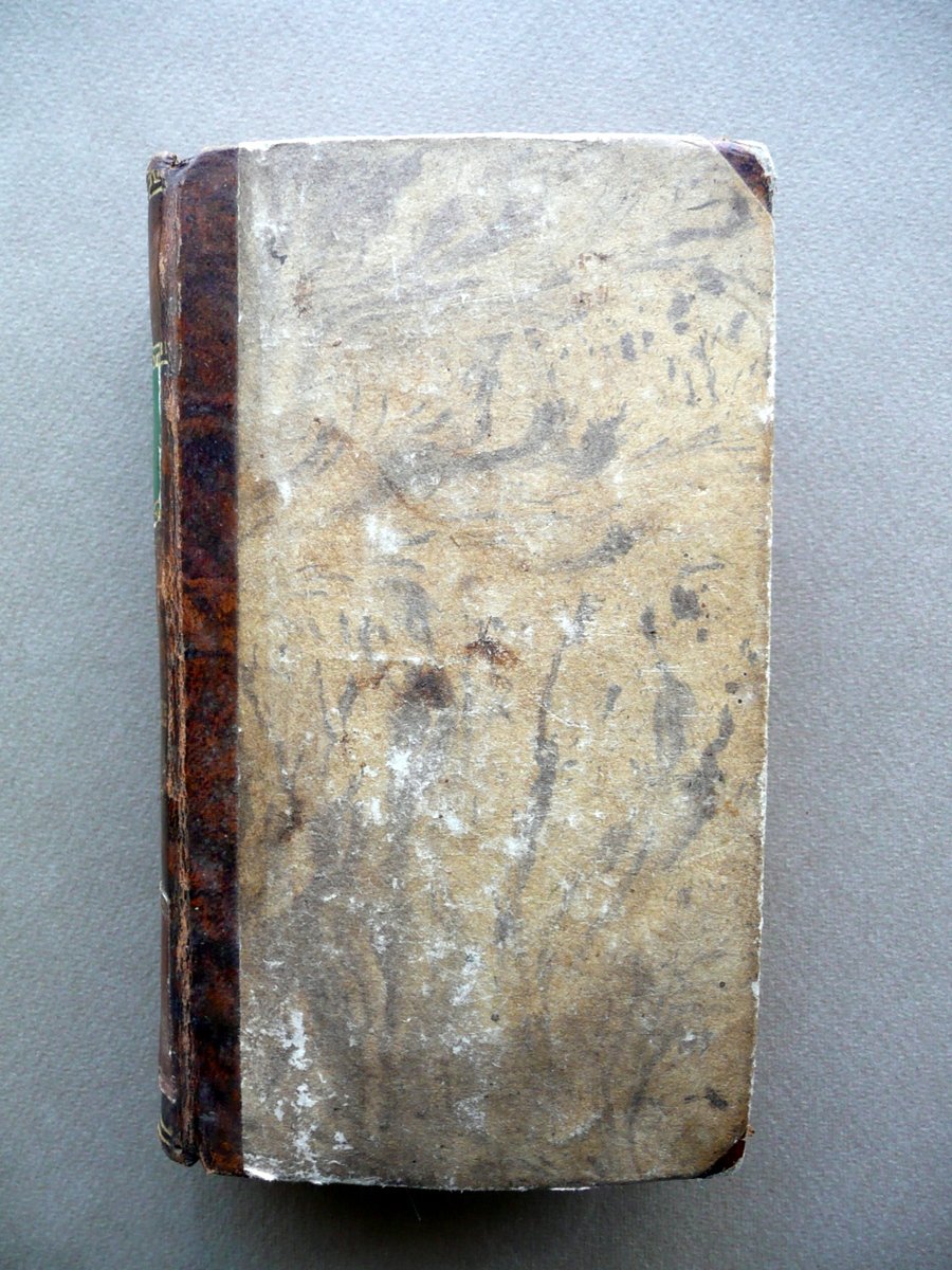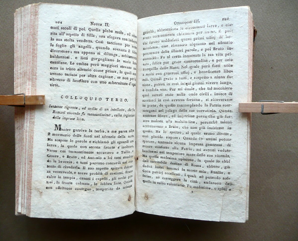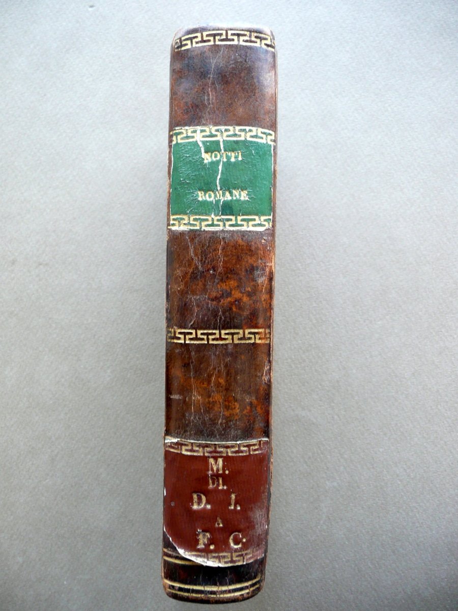 Alessandro Verri, Le Notti Romane Al Sepolcro degli Scipioni Edizione completa Con rami (opera completa in due volumi) Nella Tipografia di Pietro Agrelli, Milano, s. d. (1806 circa); cm 17x9,5, pp. 220 (volume I); pp. 212 (volume II), con in totale 7 belle tavv. incise in b/n fuori t.; legatura d'epoca in mezza pelle con titolo e alcuni fregi impressi in oro al dorso (titolo entro tassello); piatti in carta marmorizzata; tagli rossi. Opera completa in due volumi inseriti entro un'unica legatura. Condizioni di conservazione Esemplare in buone condizioni con tracce d'uso e leggeri segni del tempo; coperta con alcune lievi abrasioni, angoli dei piatti con poche piccole mancanze. Interni buoni con minuscole bruniture e qualche piccolo leggero alone; parte inf. di alcune pagine con una lieve ombra di gora che non compromette la lettura del testo; angolo inf. delle pp. 106-107 (volume I) con una circoscritta mancanza che coinvolge pochi caratteri, senza compromettere il senso del testo. Importante opera completa del Verri, rimasta celebre anche come caso di voluta finzione letteraria: l'opera fu infatti inizialmente presentata come presunta traduzione di un manoscritto greco di recente riscoperta. Opera in due volumi inseriti entro un'unica legatura, corredata da sette belle tavole incise in bianco e nero fuori testo. SETT111.L10672 N P