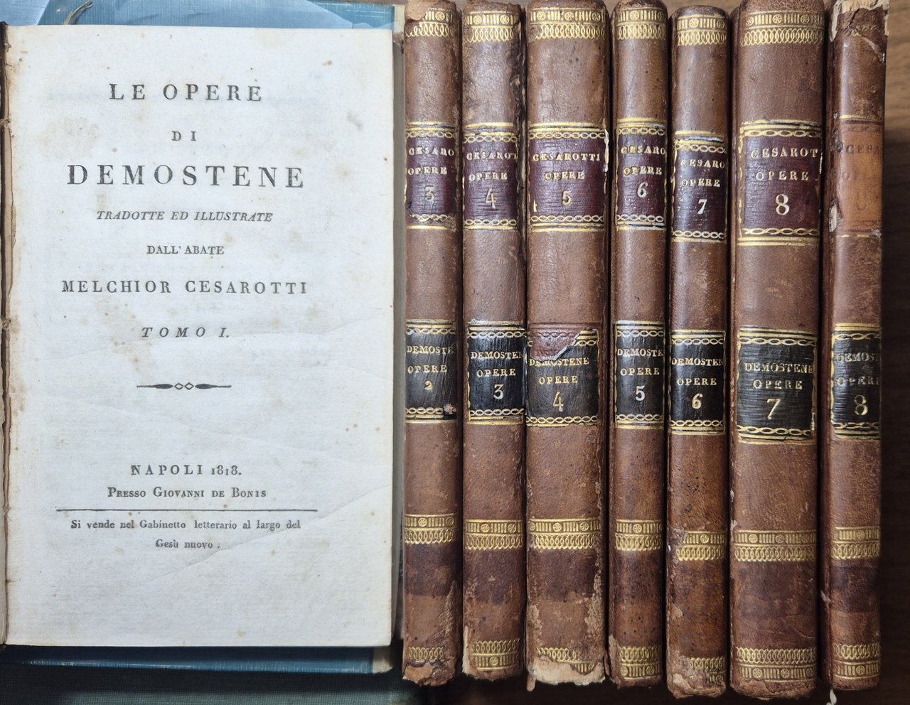 Napoli, presso Giovanni De Bonis, 1818 1819. 236 + (IV), 194, (1) + 219 +248 + 179 + 220 + 344 + 160 pagine. Copertine coeve in mezza pelle e piatti marmorizzati. Dimensioni: 12,5 x 20 cm. Stato di conservazione: molto buono (fioriture, piccole gallerie di tarlo estinto, piccole mancanze ad alcuni dorsi) Libro antico filosofia classici della letteratura