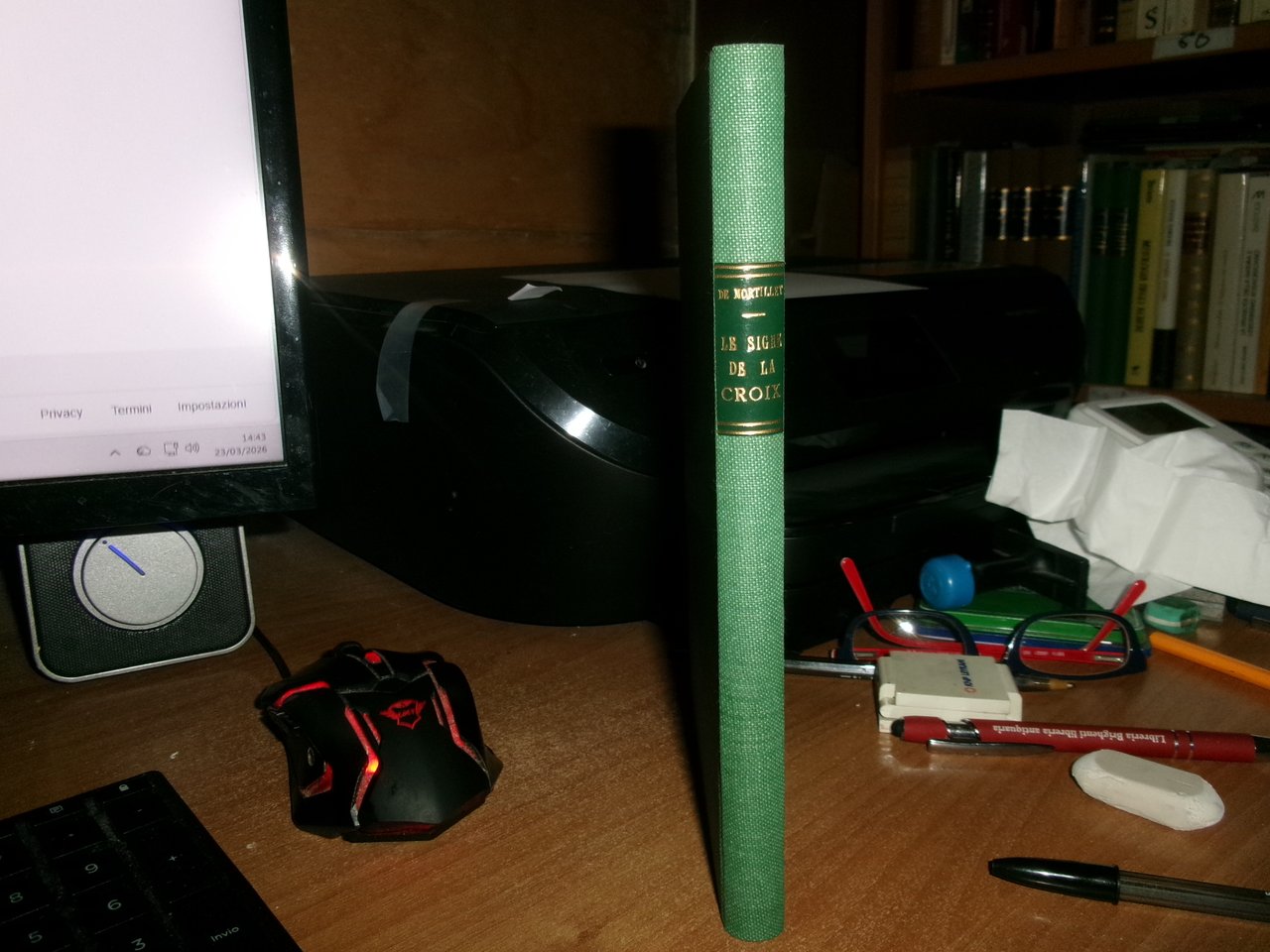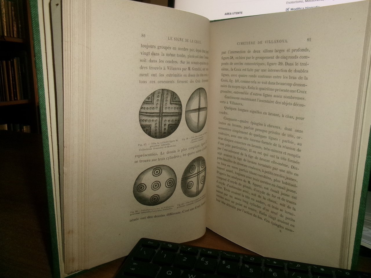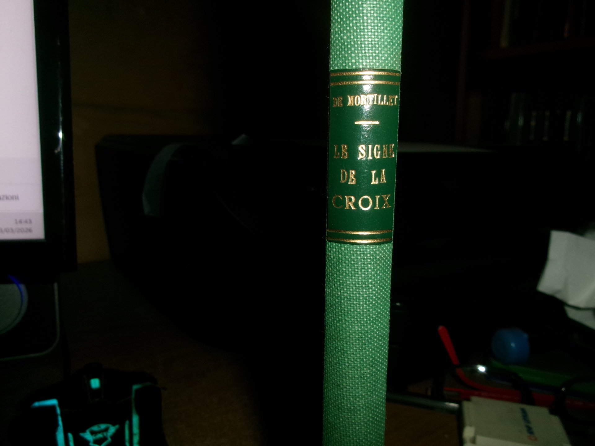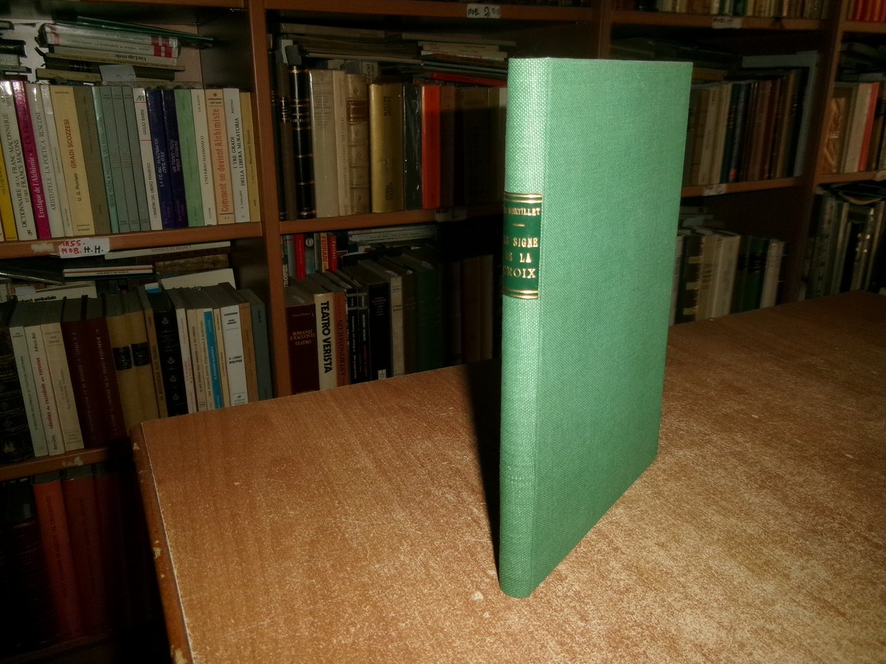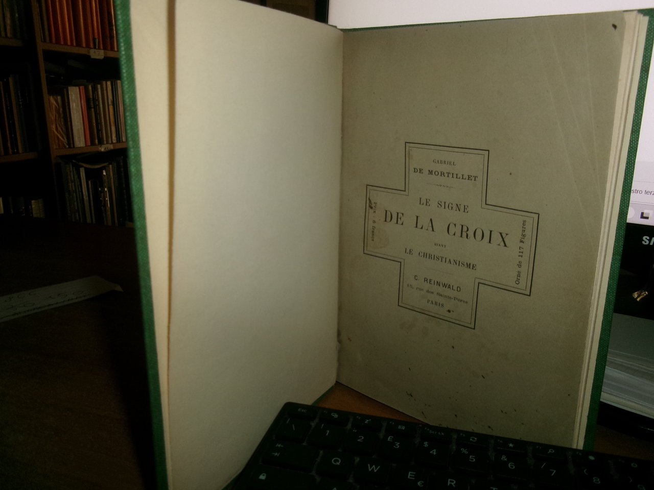 par GABRIEL DE MORTILLET. Paris, G. Reinwald Libraire, 1866. LE SIGNE DE LA CROIX avant Le CHRISTIANISME. In-8°, tela verde con titolo in oro entro tassello al dorso, brossure originali conservate. 182, (1) pp. avec 117 gravures sur bois. Ottimo esemplare in legatura artigianale con le copertine originali conservate. Non è presente l' occhietto. Edizione originale. Neg. mens. bianca cass.