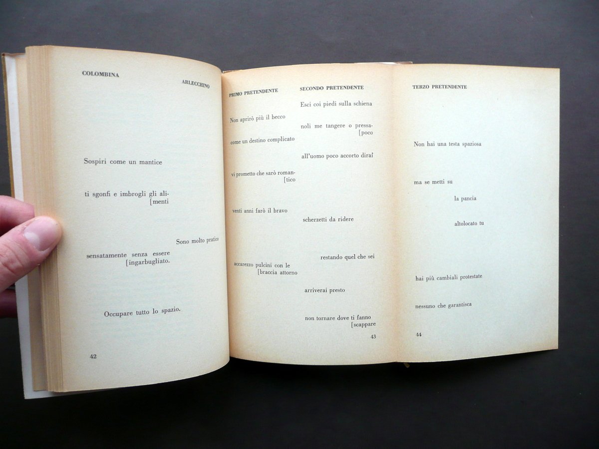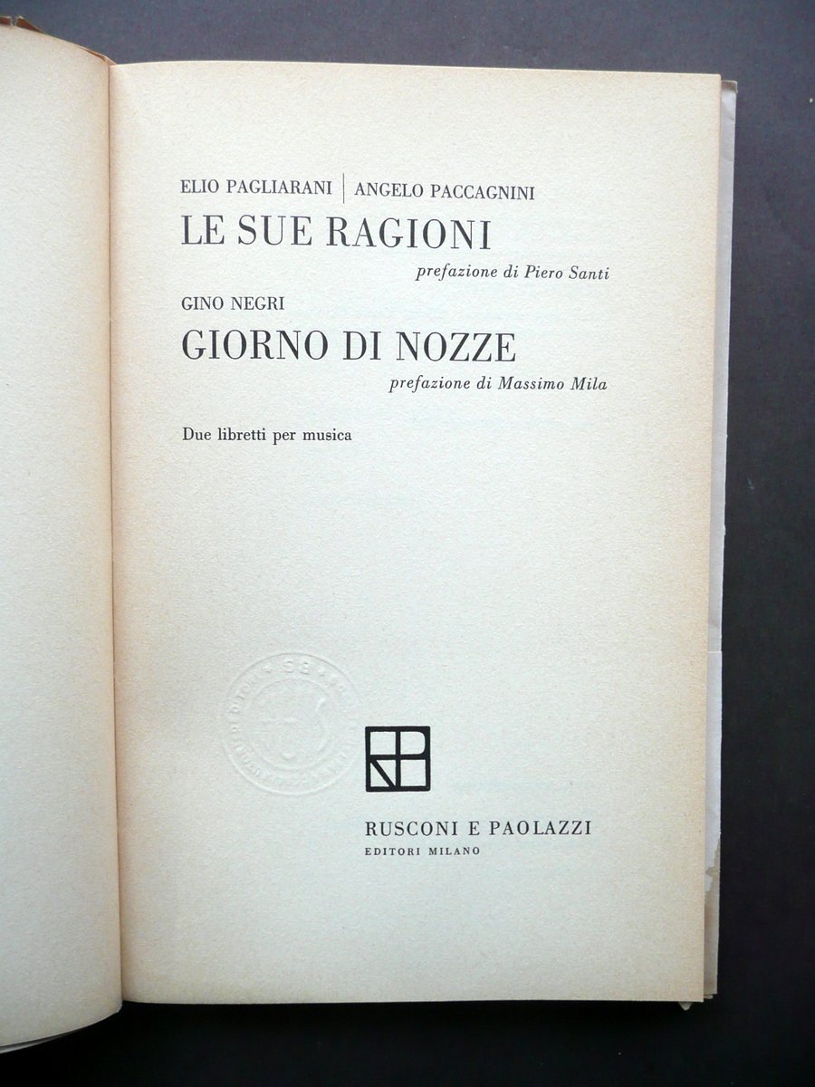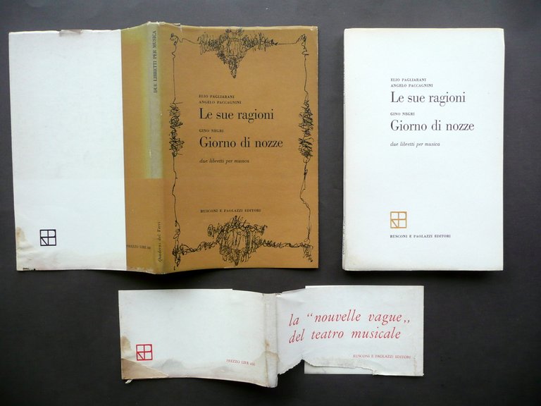 Elio Pagliarani - Angelo Paccagnini, Gino Negri, Le sue ragioni" "Giorno di nozze" Due libretti per musica Rusconi e Paolazzi, Milano 1960, cm 19,5x12,5, pp. 100; brossura ed. muta con sovraccoperta ed. a col. Acclusa la fascetta ed. (vedi foto). Condizioni di conservazione Esemplare complessivamente ben conservato con tracce d'uso; margine inf. della fascetta ed., della sovraccoperta ed. e delle brossure con una leggera circoscritta ombra di gora di vecchia umidità che interessa in misura minima e marginale poche delle ultime pagine, senza mai coinvolgere il testo (la fascetta ed. presenta anche una circoscritta mancanza e un paio di strappetti, di cui uno di alcuni cm, vedi foto); sovraccoperta ed. con qualche minimo strappetto alla cuffia sup., e con lieve ingiallimento del dorso. Interni buoni. Due libretti per opera, inseriti nella poetica dell' "opera aperta" d'ambito musicale (avanguardia musicale). SETT114.L10906 N P "