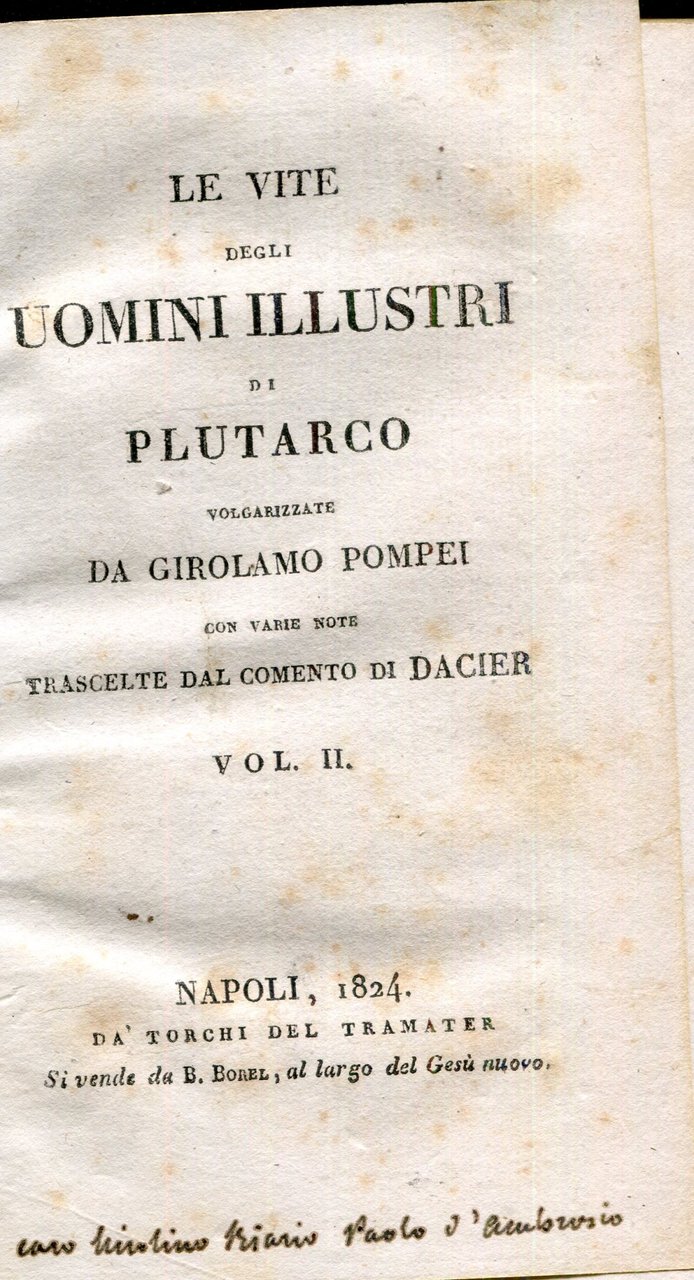Le vite degli uomini illustri di Plutarco volgarizzate da Girolamo Pompei con varie note trascelte dal comento di Dacier. vol. 2 | Libri antichi e moderni | Plutarco, ,Plutarco