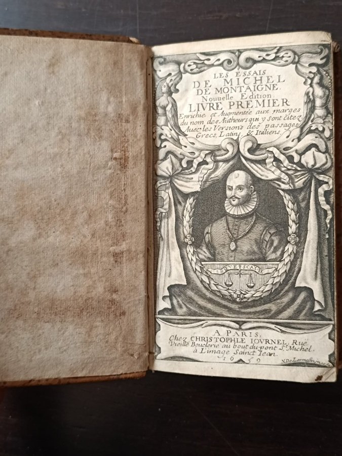 <span style="font-style: normal;">3 volumi in-12° (cm. 14,7), pp. [68] 556 [24], [4] 827 [31], [4] 610 [34] in buono stato, con frontespizi in rame; lievi e sporadiche fioriture, qualche leggera brunitura, antica firma di appartenenza al margine dei titoli dei tomi secondo e terzo. Legature coeve in piena pelle con titolo e fregi in oro ai dorsi (usure, strappi a cuffie e capitelli), tagli spruzzati, </span><i>Ex libris</i><span style="font-style: normal;"> Passerano ai fogli di guardia di tutti i volumi. Insieme in legatura omogenea dell'edizione 1659 (primo tomo) e della sua ristampa del 1666 (secondo e terzo tomo), considerata l'ultima edizione importante dei </span><i>Saggi</i> prima che venissero messi all'Indice nel 1676. Buon esemplare. (SD5)