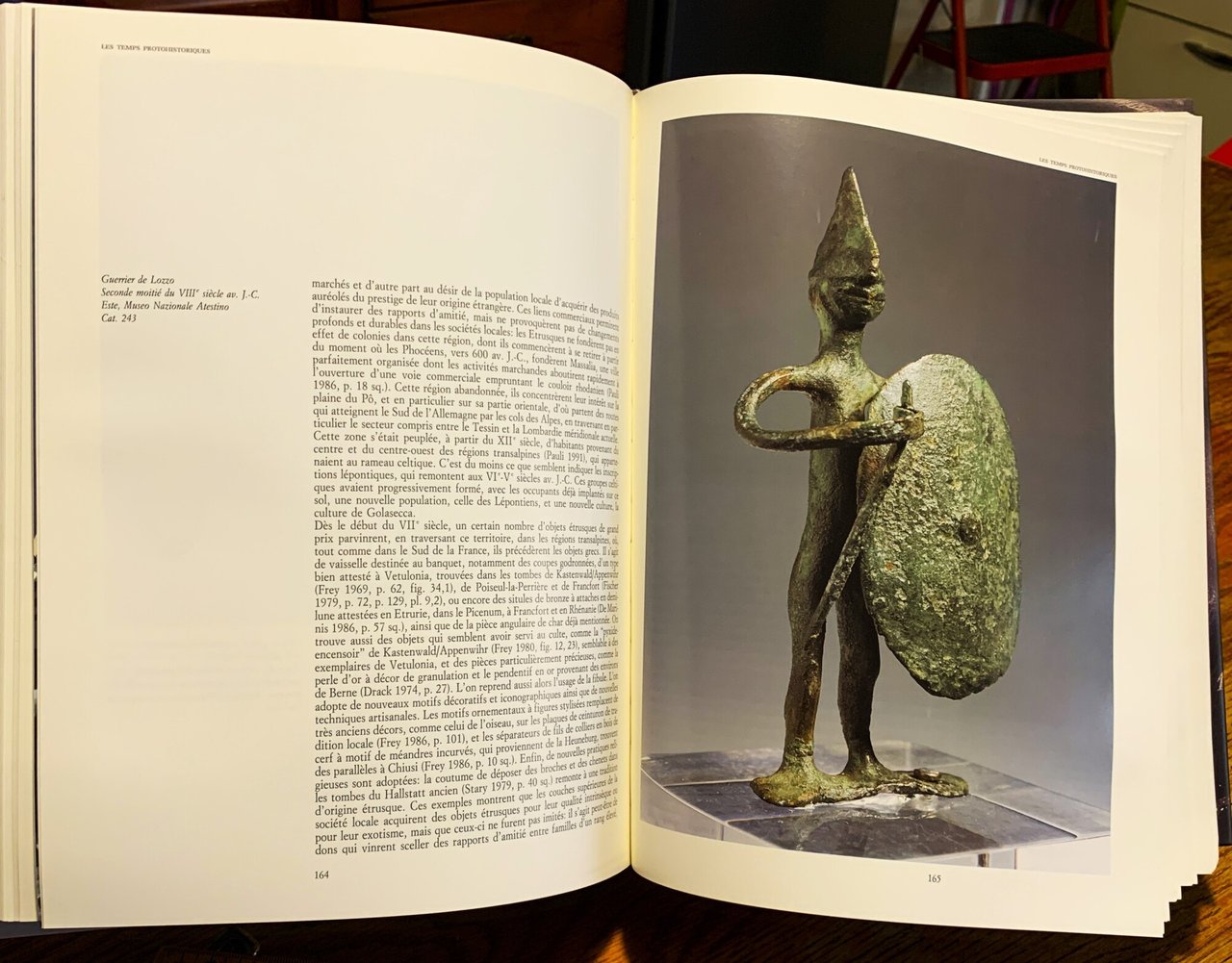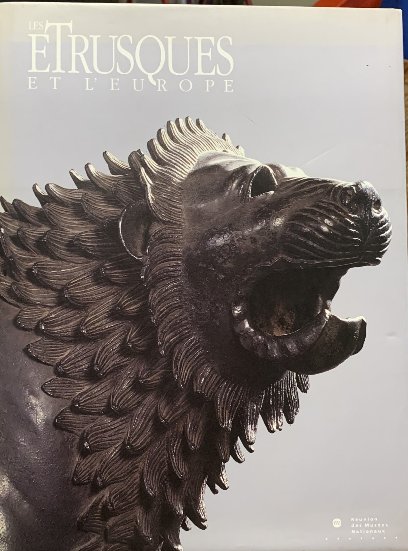 I ed.: septembre 1992. Testo in francese. Catalogo della mostra Paris (F), Galeries Nationales du Grand Palais , 15 septembre - 14 décenbre 1992 e Berlin (D), Altes Museum, 25 février - 31 mai 1993. IV/ 520/ cart./ sovraccoperta satinata con grafica in grigio/n e con illustrazione a colori passante dal primo all'ultimo piatto attraverso il dorso (Chimère d'Arezzo, détail. Fin du Ve-début du IVe siècle J.-C.. Florence, museo Archeologico. Photo p. Baguzzi-M. Matteucci). Con illustrazioni in b/n e a colori nel testo e f.t.. Stato buono-ottimo (margini della sovracc. lievemente solarizzati). Sommaire: Préserntation génèrale; Massimo Pallottino - Les Étrusques et l''Europe (La civilisation étrusque (Les Étrusques dans l'histoire; Massimo Pallottino - Mines et métaux aux origines de l'Étrurie: le culture villanovienne; Giovannangelo Camporeale - La vocation maritime des Étrusques; G. Camporeale - L'épanouissement des aristocraties et le style orientalisant; Francesco Nicosia - L'Etrurie des cités; G. Camporeale - Architecture civile et architecture religieuse; G. Camporeale - La "discipline" étrusque: espaces celestes, espaces terrestres; G. Camporeale - L'écriture et la civilisation des livres; G. Camporeale - L'au-delà; G. Camporeale - Notices n° 1/240) - L'Étrurie et l'Europe: influences directes (L'Italie et l'Europe centrale: les temps photohistoriques; Luciana Aigner Foresti - Le commerce maritime dans le Sud de la France; Bernard Bouloumié - Les Etrusques et la péninsule Ibérique; Martin Almagro-Gorbea - Les relations transalpines; Richard Adam, Dominique Briquel, Jean Gran-Aymerich, David Ridgway, Ingrid Strøm, Friedrich-Wilhelm von Hase - La diffusion du vin en Europe centrale er nord-occidentale; B. Bouloumié - L'art des situles; Giulia de Fogolari - Art étrusque et celtique; Venceslas Kruta - Icongraphie funéraire du fauve à la tête coupée; B. Bouloumié - L'écriture étrusque aux origines de l'écriture runique; Piergiuseppe Scardigli) - Les Étrusques et l'Europe. La mediation de Rome (l'arc et la colonne toscane; Gabriele Morolli - Les sarcophages à figure à demi médiévaux; Horst Blanck - Héritages lexicaux; M. Pallottino - Notices n° 241-358)) - la decouverte des Étrusques et la culture europeenne (De la renaissance au XVIIIe siècle (Le mythe étrusque en Europe entre le XVIe et le XVIIIe siècle; Mauro Cristofani - Le temple toscan dans les traités d'architecture; Gabriele Marolli) - La mode étrusque en Europe aux XVIIIe et XIXe sieclès (Le "style étrusque"; Cristiana Morigi Govi - La Grande.-Bretagne et les Étrusques; Sybille Haynes) - Le XIXe siècle: le temps des vopyageurs et des savants (L'aventure romantique; Giovanni Colonna - L'âge4 du positivisme; Filippo Delpino) - Les collections étrusques. la formation des grands musées europeens (La collection Campana et la collection étrusque du Musée du Louvre; Françoise Gaultier - Éduard Gerhard et le cabinet étrusque de l'Altes Museum de Berlin; Gertrud Platz-Horster - Émile de Meester de Ravestein et la collection étrusque des Musèes Royaux d'Art et d'Histoire; Jean Charles Balty - L'intérêt des Polonais pour l'Étrurie antique; Witold Dobrowolski - La collection étrusque de l'Érmitage; oleg Neverov - Notices n° 359/542) - Le monde moderne face à l'art étrusque (Les reproductions des peintures ètrusques; Cornelia Weber-Lehmann - Faux, pastiches, imitations; Licia Vlad Borrelli - Les faux dans l'orfèvrerie étrusque; Edilberto Formigli) - Les Étrusques dans la littérature européenne (Introduction; M. Pallottino - Les Étrusques et la littérature française; Alain Hus - La Grande-Bretagne: l'Étrurie de Huxley et de Lawrence; M. Pallottino - Lawrence: un point de vue; Christopher Miles - Les Étrusques et la littérature italienne; M. Pallottino) - Épilogue (L'étruscologie au XXe siècle; M. Pallottino - Gustave VI Adolphe, le "roi archéologique"; Carl Nylander - Notices n° 543/620)) - Table chronologique - Bibliographie générale - Index des noms - Indexx photographique des ouvres.
