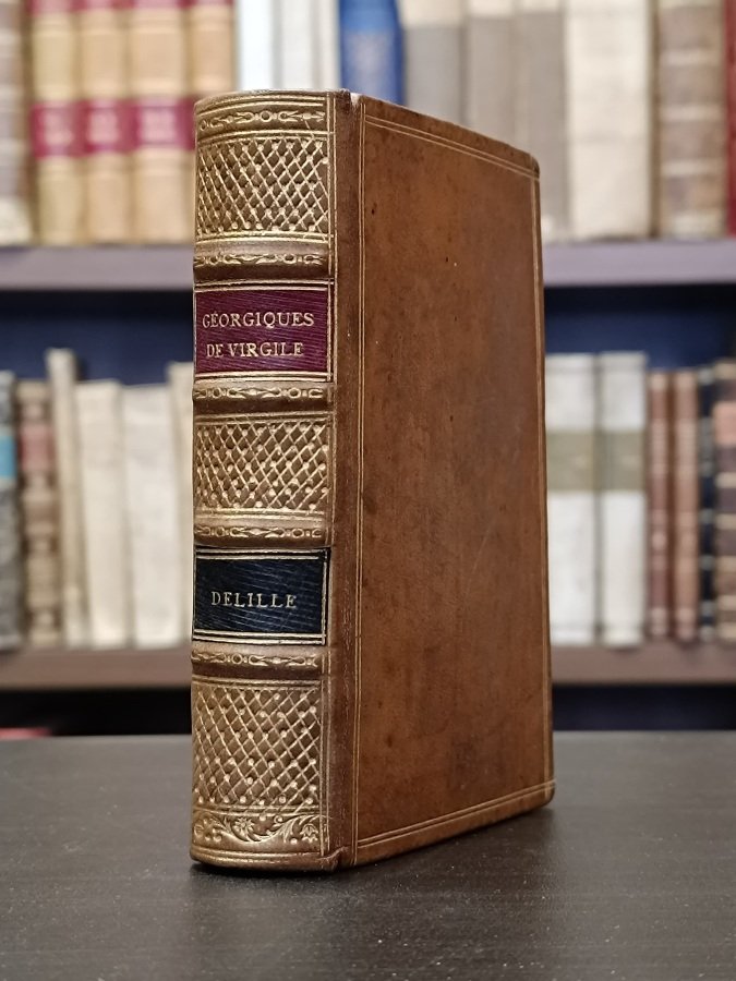 In-12° (cm. 12,4), graziosa legatura coeva in piena pelle nocciola, dorso a nervi con titolo in oro su doppio tassello bordeaux e verde, fitti fregi ai comparti e altri alle nervature sempre in oro, piatti inquadrati da sobrie cornici di doppi filetti oro, tagli rossi, risguardi marmorizzati; pp. 412 in stato molto buono (sporadiche fioriture). Bella edizione francese delle Georgiche di Virgilio. Esemplare molto buono. (NR6)