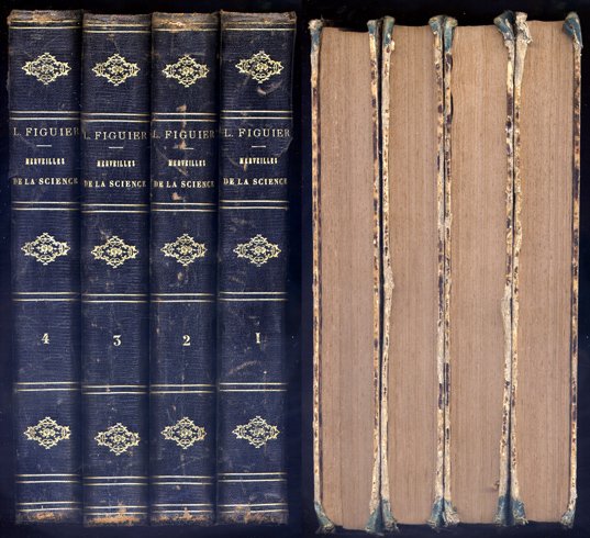 Paris, Furne, Jouvet et Cie., Éditeurs, 1867-1870. Cuatro volúmenes en folio; 1 h., 743 pp. + 1 h., 703 pp. + 2 hs., 752 pp. + 2 hs., 744 pp., con un total de 1815 ilustraciones entre el texto, además de una lámina con el retrato del autor. Encuadernación uniforme, en media piel, de la época. Una fascinante síntesis del desarrollo tecnológico del Siglo XIX. El Tomo I analiza las máquinas y barcos a vapor, las locomotoras y ferrocariles, los pararrayos, la pila voltáica, las máquinas eléctricas y el electromagnetismo. El segundo está dedicado a la telegrafía aérea, eléctrica y submarina junto al cable trasatlántico y la galvanoplastia, junto al dorado y plateado electro-químico, los aerostatos y el uso del eter como anestésico. El tercero trata de la fotografía, estereoscopio, pólvoras de guerra, artillería y armas portátiles, construcciones acorazadas, drenaje y piscicultura. El cuarto al alumbrado, la calefacción la ventilación, los faros, pozos artesianos, campanas neumáticas, motores de gas, el aluminio y el planeta Neptuno.