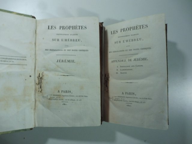 2 voll. in 8 (cm 13 x 21), pp. (4) + 542 + (2); (4) + 144). Legatura coeva in mezza pelle. Traduzione francese dall'ebraico della Profezia di Geremia.