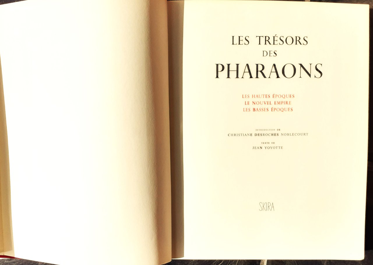 I ed. svizzera, collection établie et dirigée par Albert Skira Les Trésors du Mond", vol. 7. Testi in francese. Introduction de Christiane Desroches Noblecourt (Directeur d'Etudes à l'Ecole pratique des Hautes Etudes, Paris). In-4, pp. XII+260, cart., sovracc. ill. a coll. (détail du couvercle du cercueil de Pétosiris, IV siècle avant notre ère, provenant de Touna el-Gebel). Con 120 illustrazioni applicate di cui 85 a coll. Stato buono (alcuni piccoli strappi ai margini superiore e inferiore della sovraccoperta)"