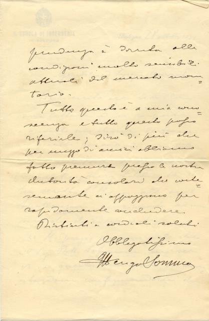 Lunga lettera autografa (formato cm.21,5x13,8), con firma estesa, compilata su tre facciate di quattro in data 18 ottobre 1831 su carta intestata "R.Scuola di Ingegneria in Bologna". La lettera è inviata all'Avv. Gisberto Lami di Pisa (unita la busta affrancata, intestata "Cattedra di Economia ed Estimo") e riferisce in merito ad un deposito in favore di una costituenda Società scientifica internazionale. Allegato biglietto da visita con alcuni appunti manoscritti a matita. Ulderigo Somma fu docente nella R.Università di Bologna ed una delle maggiori autorità internazionali nel campo dell'economia agraria ed estimativa, autore di molti libri. Codice libreria 44499.