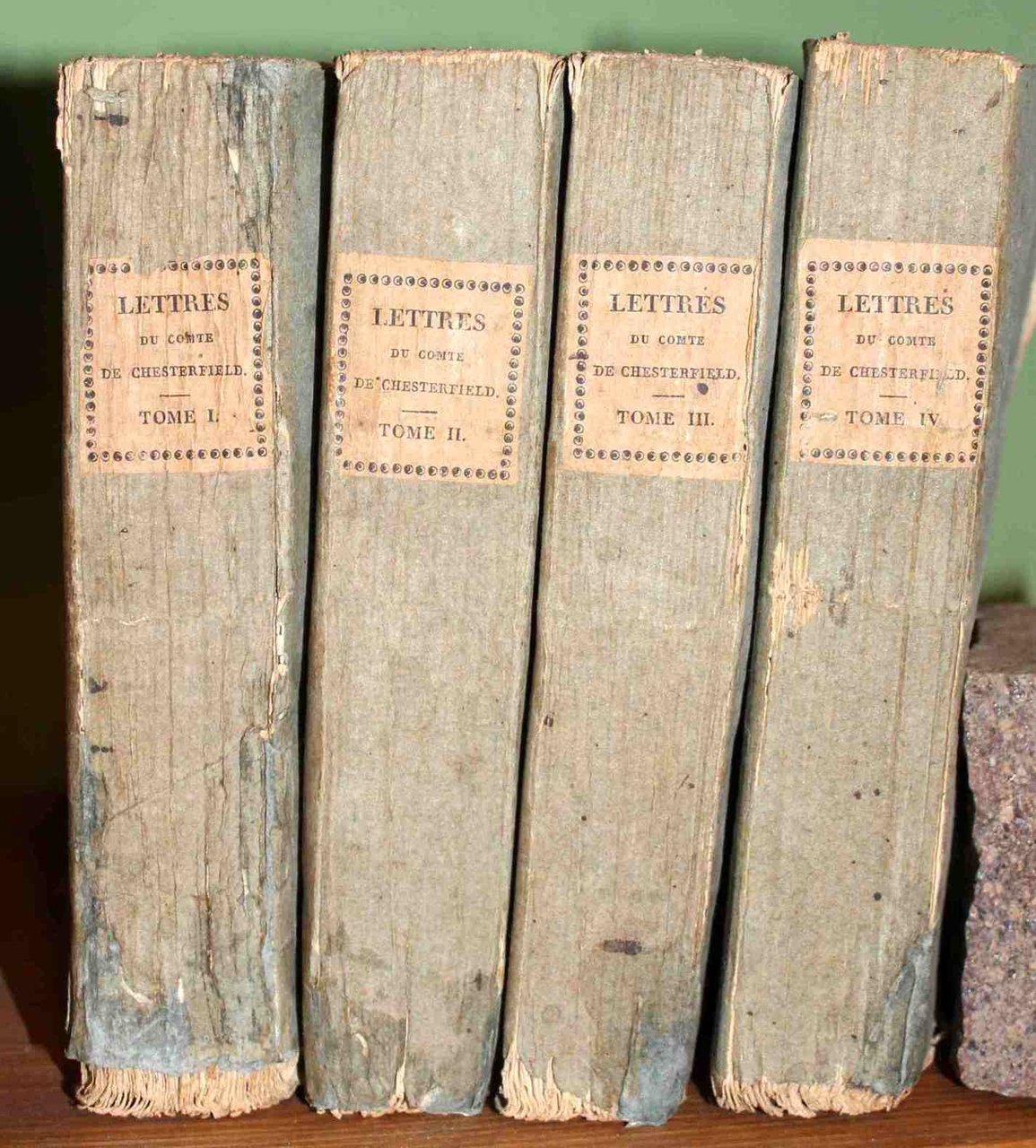 4 volumi in 12°, pp. (4), 407; (4), 396, (1); (4), 372; (4), 408. Brossure mute azzurrine originali (rinforzi alle cuffie inferiori). Dorsi con titoli a stampa su etichetta. Timbro privato di possesso agli occhietti. Copia in ordine. Cfr: Brunet, I, 1836, note.