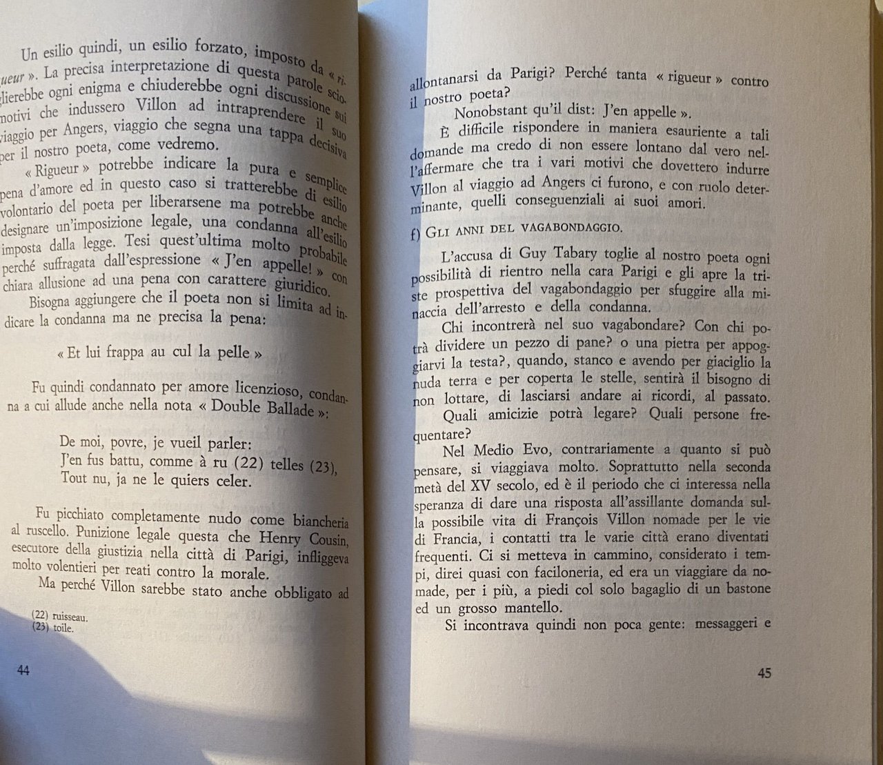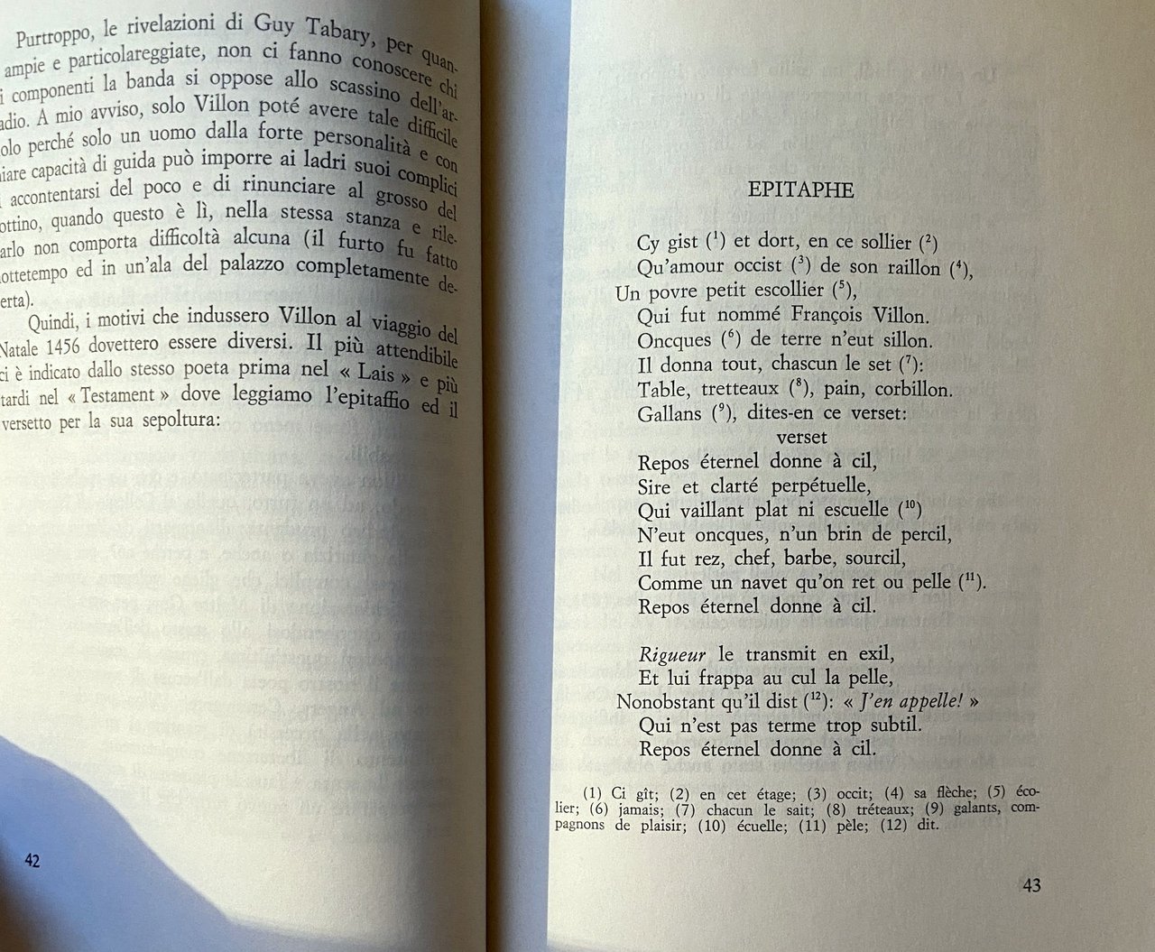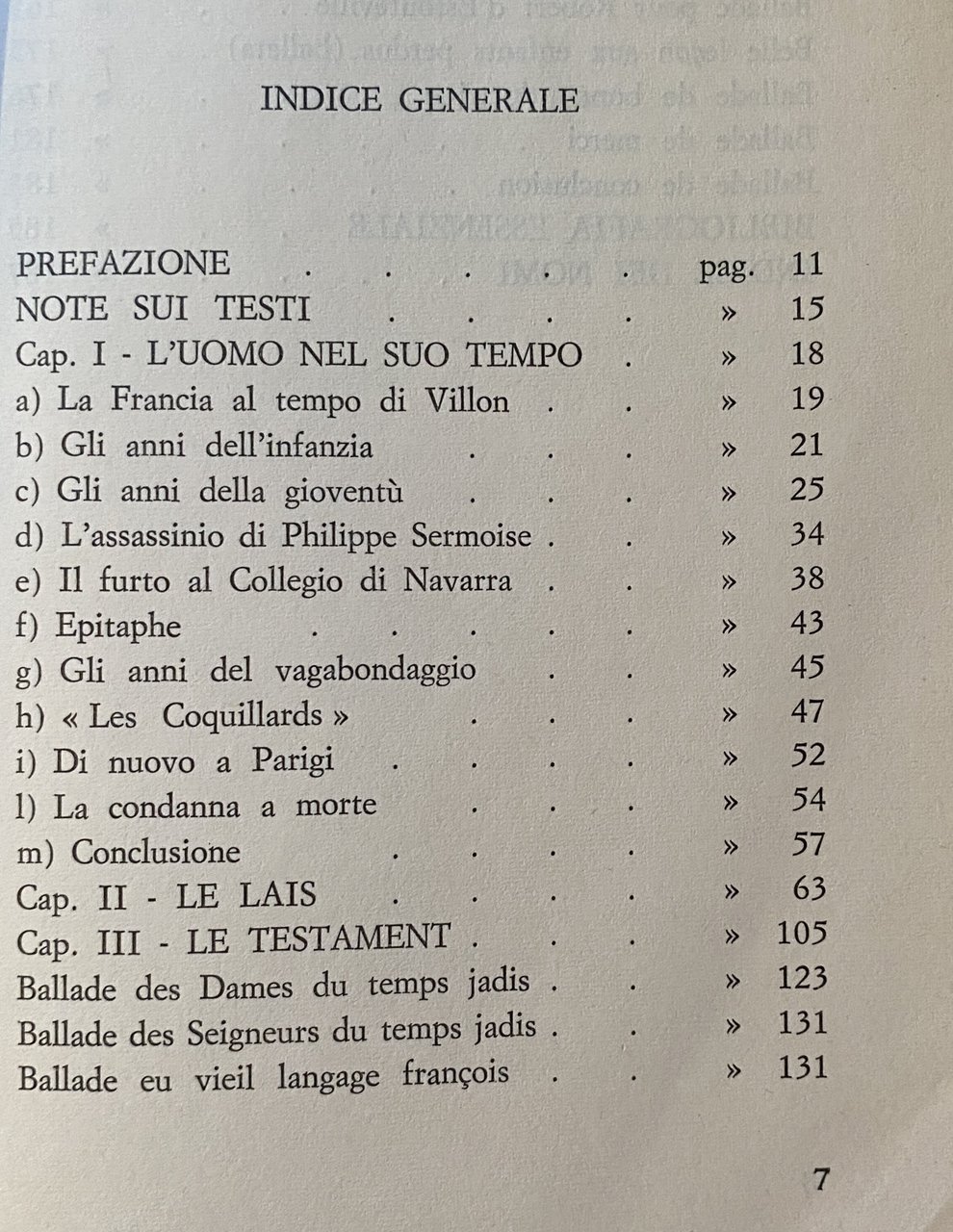 Soggetti: Studi culturali, Letteratura francese, Saggi, Lezioni universitarie, Critica letteraria, Ballate, Cultura medievale, Medioevo, Epitaffio, Poesia, Poeti francesi, François de Montcorbier de Loges Corbeuil, Lascito, Testamento, Marcel Schwob, Quattrocento, XVI secolo, Maledetto, Truffatori, Burle, Parigi, Opere, Antifrasi, Linguaggio, Linguistica, Charles Augustin Sainte-Beuve Ballata degli impiccati, Ballade des pendus, Épitaphe Clément Marot Mais où sont les neiges d'antan Dove sono le nevi di un tempo? Dame del tempo Miti Leggende Jean-Claude Mühlethaler Pseudonimo Roger Dragonetti Villonnerie Repues Franches Quartina Cecco Angiolieri Avventurieri Arsenal Pierre Levet Fonti Bibliografia Riferimento Libri rari Vintage fuori catalogo Collezionismo Abate Prompsault Paul Lacroix Auguste Longnon Gaston Paris Pierre Champion Italo Siciliano Giuseppe Antonio Brunelli Pierre Guiraud David Kuhn Demarolle Fabrizio De André Orleans Giovanna d'Arco Jean Favier Jean Dufournet Gert Pinkernell Poésies complètes Carpe diem Ubi sunt Memento mori Danza macabra Danse macabre Antoine Vérard Manoscritti Fontana Maubuée Rodin Belle Heaulmière Nonda André Malraux Ezra Pound Claude Debussy Georges Brassens Tutti morimmo a stento Charles Giblyn Vagabondo Se fossi re Repues franches François Rabelais Arthur Rimbaud Charles Baudelaire Paul Verlaine Gérard de Nerval Jean Richepin Victor Hugo Théophile Gautier Théodore de Banville Influenze culturali Robert Louis Stevenson Osamu Dazai Ossip Mandelstam Claude Fauchet Simbolismo Philippe Sermoise Assassinio Impiccagione Coquillards Claude Thiry Pantagruel Châtelet Affare Ferrebouc Fratelli umani Frères humains Coislin Mecenatismo Cortigiani Sorbona Ottave Ottonari Amore cortese Trovieri Congé Avventura Nemici Bersagli Autorità Polizia Ecclesiastici Borghesi Usurai Jacquerie Studenti Borgognoni Università Carlo VII di Francia Borghesia Saint Benoit Guy Tabary Baccalauréat Arts Maîtrise Vagabondaggio Esilio Carcere Brezé Guillaume Satira Calembours Equivoci Meditazioni Eustache Deschamps Régnier Marthe Acrostico Mario Roques Leo Spitzer Foulet Frappier Viver André Burger Felix Leoy Châtelet Navarra Louviers Paradossi Alain Chartier Amis Bon-Conseil Bourbon Charles d'Orléans Clerc Collège Commento Blois Corps Dame Dieu de Paradis Dufournet Fortuna Giovanni Bonanno Dotoli Jargon Meung Gerson Jenin Université Sorbonne Maistre Marie Marot Mirouer Neri Nizet Noël Paradosso Poetica Proverbi Rime Schena Strofa Thuasne Cultural studies French literature Essays University lessons Literary criticism Ballads Medieval culture Middle Ages Epitaph Poetry Poets Legacy Fifteenth XVI century Cursed Fraudsters Pranks Paris Works Antiphrase Language Linguistics Ballad of the hanged men Myths Legends Pseudonym Quatrain Adventurers Sources Bibliography Reference Rare books Out of print Collectibles Abbot Joan of Arc Danse Macabre Wanderer If I Were King Cultural Influences Symbolism Assassination Hanging Human Brothers Patronage Courtiers Sorbonne Octaves Octonaries Courtly Love Trouveres Adventure Enemies Targets Authorities Police Ecclesiastics Bourgeois Moneylenders Students Burgundians University Charles VII France Bourgeoisie Wandering Exile Prison Satire Misunderstandings Meditations Paradoxes Commentary Fortune Poetics Proverbs Rhymes Verse