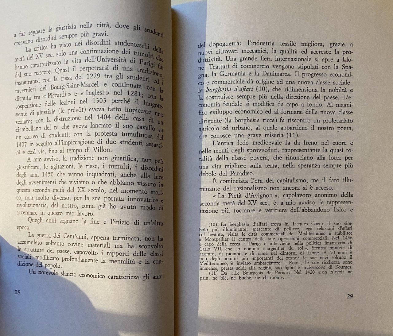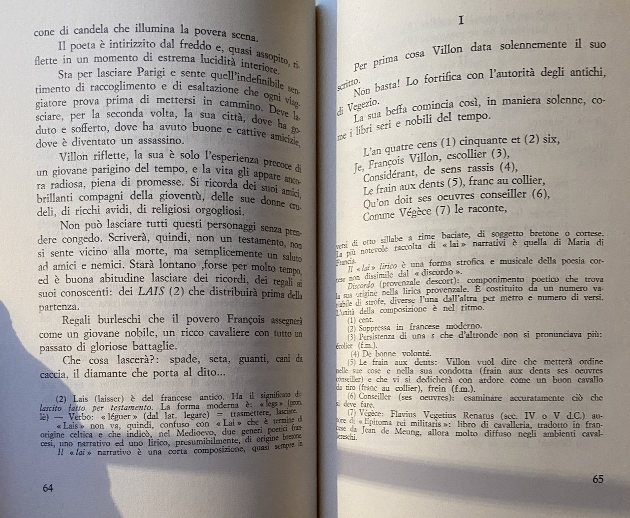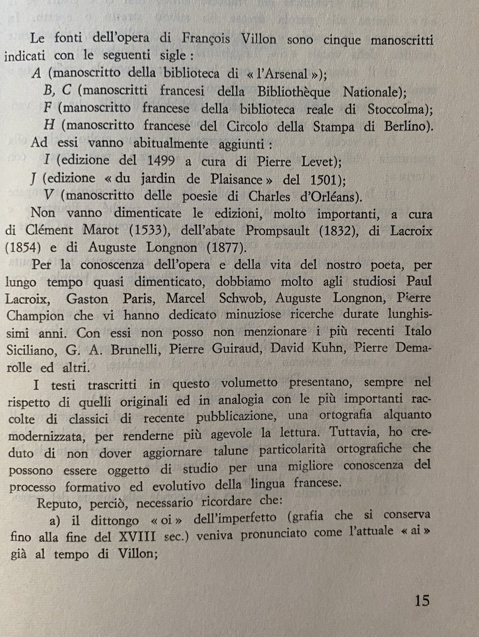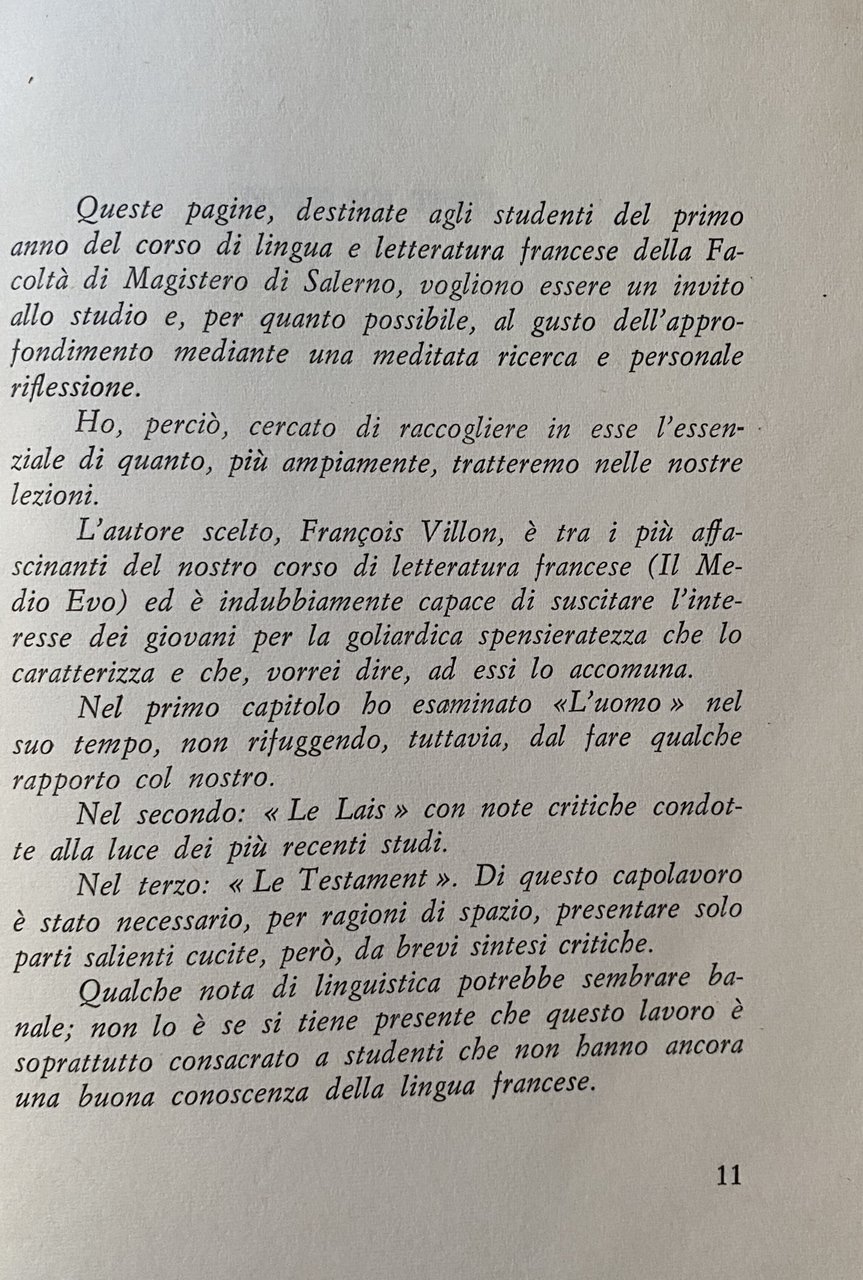 Queste pagine, destinate agli studenti del primo anno del corso di lingua e letteratura francese della Facoltà di Magistero di Salerno, vogliono essere un invito allo studio e, per quanto possibile, al gusto dell'approfondimento mediante una meditata ricerca e personale riflessione. Ho, perciò, cercato di raccogliere in esse l'essenziale di quanto, più ampiamente, tratteremo nelle nostre lezioni. L'autore scelto, François Villon, è tra i più affascinanti del nostro corso di letteratura francese (Il Medioevo) ed è indubbiamente capace di suscitare l'interesse dei giovani per la goliardica spensieratezza che lo caratterizza e che, vorrei dire, ad essi lo accomuna. Nel primo capitolo ho esaminato L'uomo nel suo tempo, non rifuggendo, tuttavia, dal fare qualche rapporto col nostro. Nel secondo: Le Lais con note critiche condotte alla luce dei più recenti studi. Nel terzo: Le Testament. Di questo capolavoro è stato necessario, per ragioni di spazio, presentare solo parti salienti cucite, però, da brevi sintesi critiche. Qualche nota di linguistica potrebbe sembrare banale; non lo è se si tiene presente che questo lavoro è soprattutto consacrato a studenti che non hanno ancora una buona conoscenza della lingua francese.