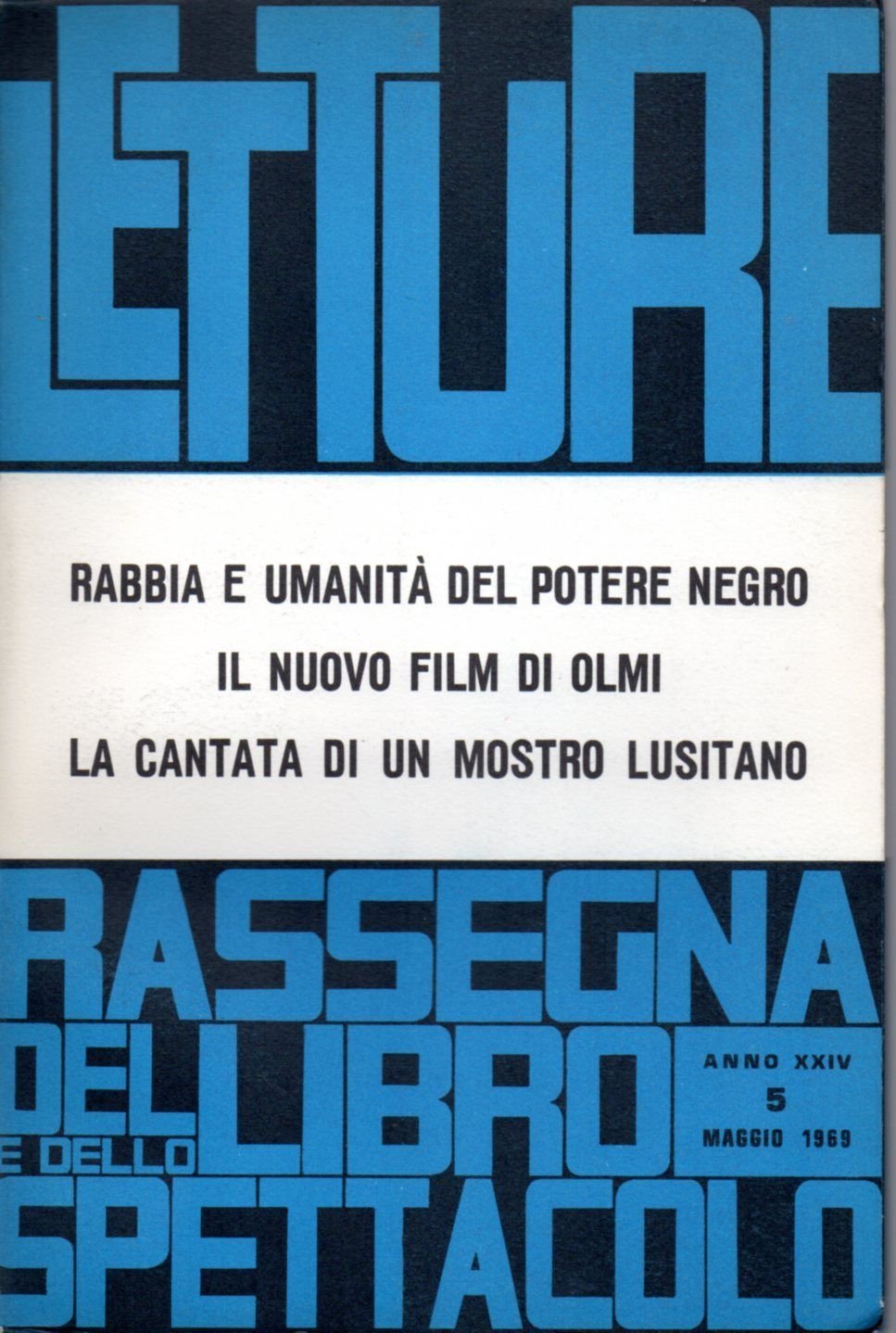 LETTURErassegna critica del libro e dello spettacoloANNO XXIV n^5 maggio 1969Rabbia e umanità del potere negro di Gottardo BlasichLa canzone italiana: tante inutili voci di Franco Lorenzo ArrugaGiovanni Arpino, Il buio e il mieleRenzo Rossellini, Addio al passatoRaffaele Crovi, Il franco tiratoreElia Kazan, Il compromessoLina Wertmuller, 2+2 non fa più 4Roberto Rossellini, Atti degli ApostoliIl 'Marcel ritrovato' di Gramigna in ottimo stato (gr.200)e342