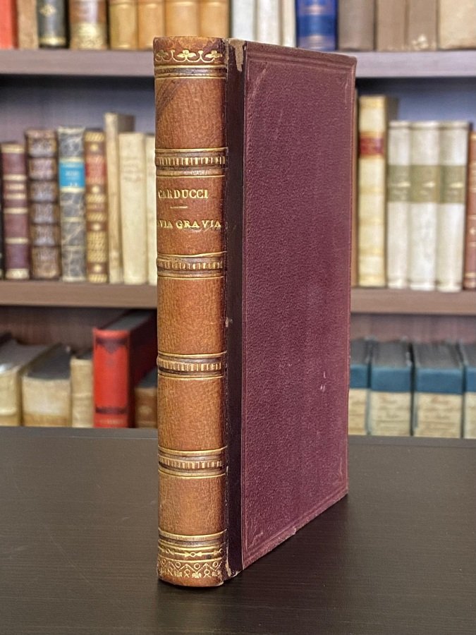 In-16° (cm. 15,6), legatura coeva in mezza pelle, dorso a nervi con titolo, filetti e fregi in oro e altri filetti a secco (minime tracce d'uso), piatti in percallina bordeaux inquadrati da filetti a secco ornati da fregi floreali sempre a secco agli angoli, risguardi marmorizzati; pp. [4] XXXIX [1b] 152 [4] in ottimo stato (lieve brunitura uniforme). Edizione definitiva (l'originale fu pubblicata a Pistoia nel 1868) di questa raccolta di versi composti dall'autore tra il 1861 e la fine del 1867, rivista e riordinata dallo stesso Carducci su richiesta dell'editore [p. III]. Esemplare molto buono. (NR6)