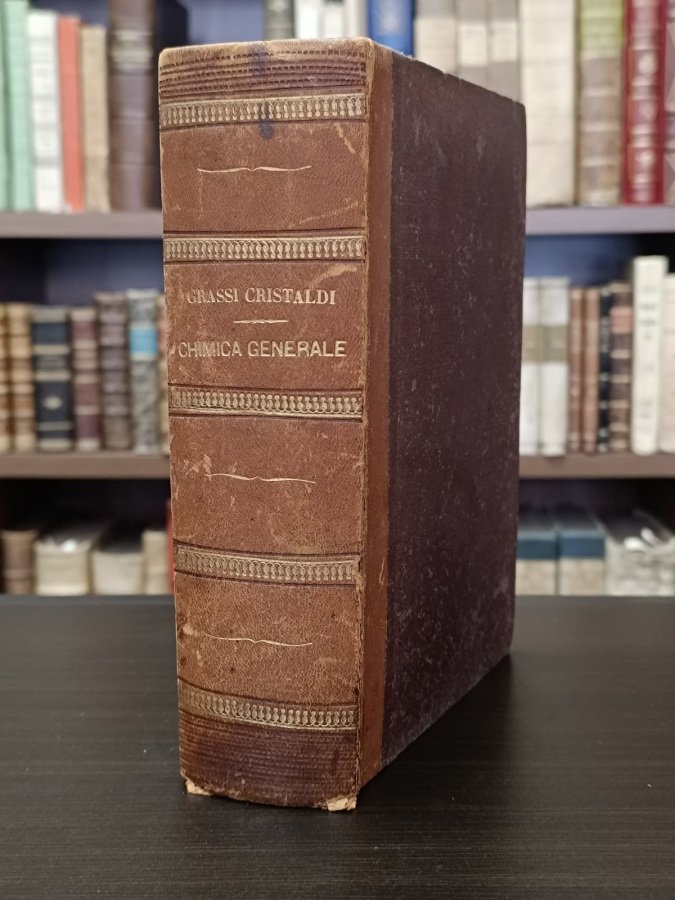In-8° (cm. 20,5), legatura coeva in mezza pelle nocciola, dorso liscio con titolo e fregi in oro ed altre impressioni a secco (difetto alla cerniera anteriore), tagli spruzzati in rosso; pp. [4] 1045 [1b] in stato molto buono; lieve brunitura uniforme, date al titolo manoscritte. Raro testo didattico del Grassi Cristaldi presso l'Istituto Chimico di Catania destinato agli studenti universitari; rappresenta un importante esempio di manualistica scientifica italiana del primissimo XX secolo. Esemplare molto buono. (NO8)