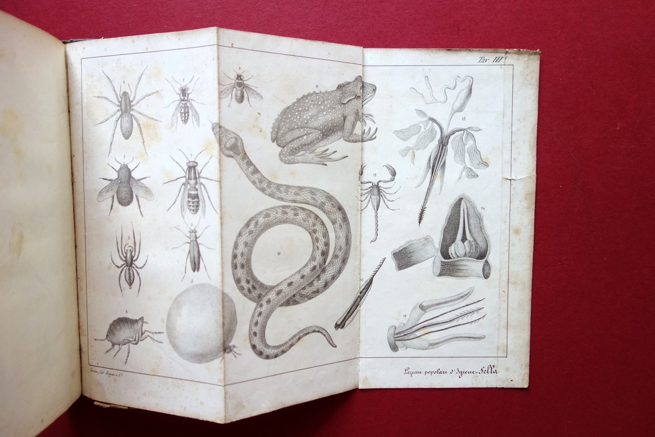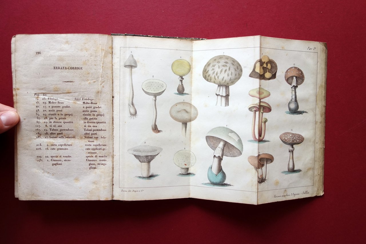 Dott. Alessandro Sella, Lezioni popolari di Igiene Rurale e Privata Presso Ignazio Fecia Editore - Libraio, Biella 1842; cm 19,5x11,5; pp. 296 pi√π tre belle tavole litografiche rip. al termine del testo, due delle quali a colori (lit. Doyen); legatura d'epoca in tutta tela con titolo e piccoli fregi impressi in oro al dorso. Frontespizio con timbro - ex libris del precedente proprietario. Condizioni di conservazione Esemplare in buone condizioni con tracce d'uso; coperta con alcune leggere macchiette e marginali abrasioni / mancanze ai piatti; al dorso un paio di piccole cuciture probabilmente per rinforzo della legatura, esemplare ben saldo e compatto (vedi foto). Interni buoni con alcune piccole leggere bruniture; margine inf. ed esterno di alcune pagine con una lieve ombra di gora che non interessa o non compromette la lettura del testo. Tavole ben conservate con alcune marginali tracce di sporco e pochi piccoli strappetti al margine esterno. Corredato da tre belle tavole litografiche ripiegate pi√π volte, due delle quali a colori raffiguranti funghi (vedi foto). SETT214.L21050 N