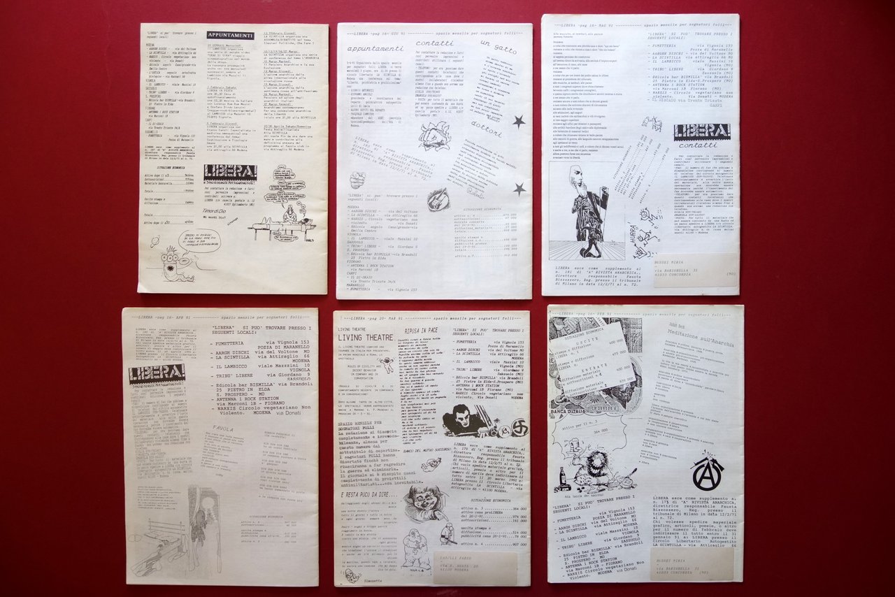 Sei numeri di rivista, Libera! spazio mensile per sognatori folli giornale dei libertari autogestiti modenesi Numeri 3 - 4 - 5 - 6 - 7 - 11 1991-92 1991-92; cm 29,5x21; pp. 16 ad eccezione del numero 3 di pp. 20, con numerose ill. in b/n nel t. e alla copertina. Esemplari completi, a fogli sciolti. Acclusi due volantini, uno relativo a un laboratorio di teatro con Stephen Schlberg, aderente al movimento del Living Theatre. 6 numeri completi. Condizioni di conservazione Riviste tutte in buone condizioni con leggere tracce d'uso, qualche pressoché trascurabile sgualcitura a margini e angoli; angolo inf. del numero 11 con leggera traccia di piega che interessa la copertina e le prime otto pagine (vedi foto). Interni buoni. Interessante raccolta di rivista del panorama anarchico modenese. Acclusi due volantini di cui uno relativo a un laboratorio di teatro con Stephen Schlberg, aderente al movimento del "Living Theatre". SC03.D16489 BIS N "