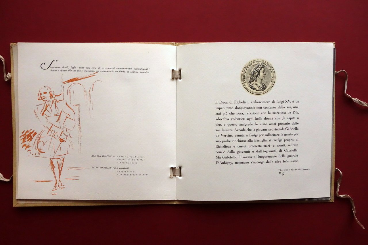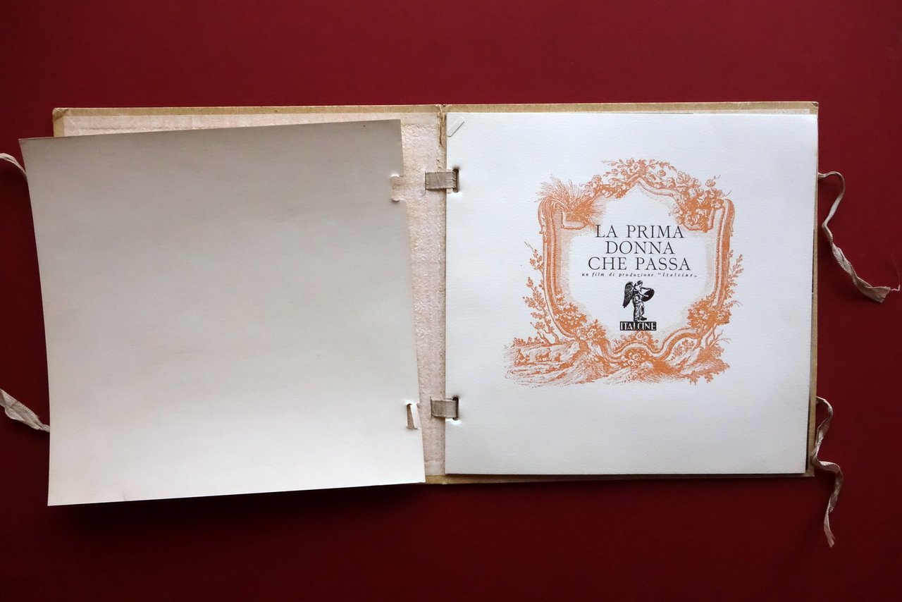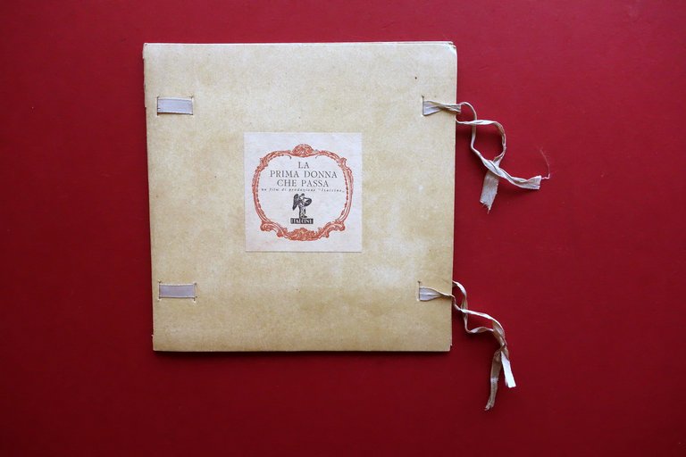 Libretto - cartella, La prima donna che passa" un film di produzione "Italcine" Italcine (Tipi Squarci e Figli), Roma 1940; cm 20,5x20,5; pp. 12 di testo pi√π 3 pp. contenenti ill. fotografiche in b/n di scene del film; gradevole legatura in cartonato ed. con laccetti per chiusura in stoffa. Condizioni di conservazione Buone condizioni con tracce d'uso, legatura con taglietti in corrispondenza delle cuffie, quello alla cuffia superiore di circa 3-4 cm. Risguardo anteriore staccato dal corpo del testo, peraltro interno buoni, compatti. Elegante edizione cinematografica che contiene una sinossi del film e varie illustrazioni fotografiche tratte dalla pellicola. OPEB.5759 N "