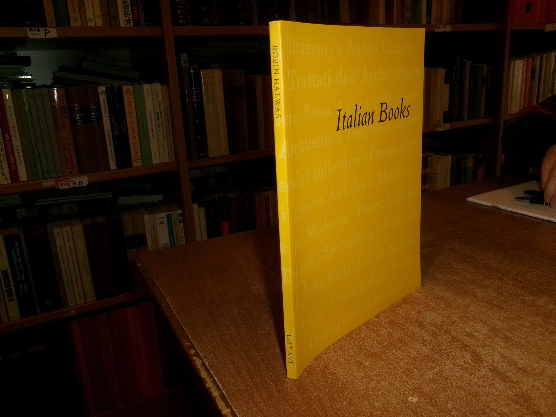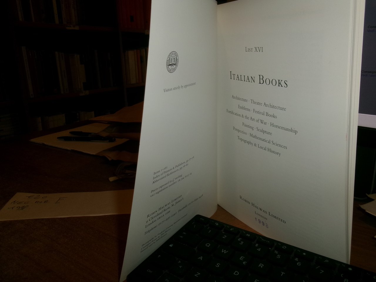 (Catalogue) List XVI: Italian Books: Architecture - Theatre Architecture - Emblems - Festival Books - Fortification & the Art of War - Horsemanship - Painting - Sculpture - Perspective - Mathematical Sciences - Topography & Local History. [ Robin Halwas Limited, booksellers' catalogue,1997 ]. In-8°, br. 80 pp. con numerose illustrazioni/fac-simili n.t. Come nuovo con testo in inglese. Neg. mob. E