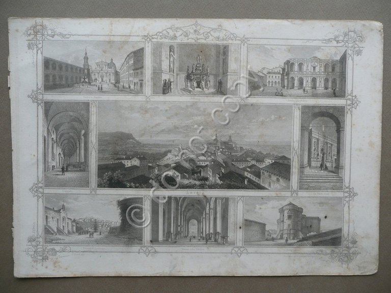 Vedute multiple, Loreto Vedute multiple V. Poiret del., Inc. e Stamp. dallo Stab. Artistico del Lloyd Austriaco, Trieste, s.d. (metà Ottocento circa), serie di vedute incise in b/n su carta, cm 23x33,5. Retro con alcune note d'epoca manoscritte. Condizioni di conservazione Esemplare in buone condizioni con tracce d'uso, alcune lievi bruniture e aloni, angoli con piccoli difetti, retro con alcune annotazioni d'epoca a penna (vedi foto), due margini lievemente rifilati, un margine con tracce di precedente inserimento entro volume.