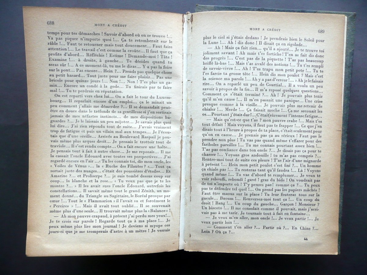 Louis-Ferdinand Céline, Mort a crédit roman Denoel et Steele, Paris 1936; cm 20,5x13,5; pp. 698; legatura coeva in tutta tela con titolo impresso in oro al dorso; contropiatto ant. con applicato ex libris del precedente proprietario. Testo in francese. Condizioni di conservazione Esemplare ben conservato con tracce d'uso, coperta con qualche minimo poco visibile alone, poche minuscole abrasioni. Interni buoni, leggermente ingialliti; risguardi con alcune piccole leggere bruniture e tracce di nastro adesivo; margine int. di poche pagine con piccole tracce di vecchia applicazione, rinforzati mediante braghetta cartacea (esemplare ben saldo e compatto); margine est. di pagina 689 con un paio di minimi strappetti. Rara prima edizione (stampata l'8 maggio 1936). Testo in francese. SETT131.L13332 N