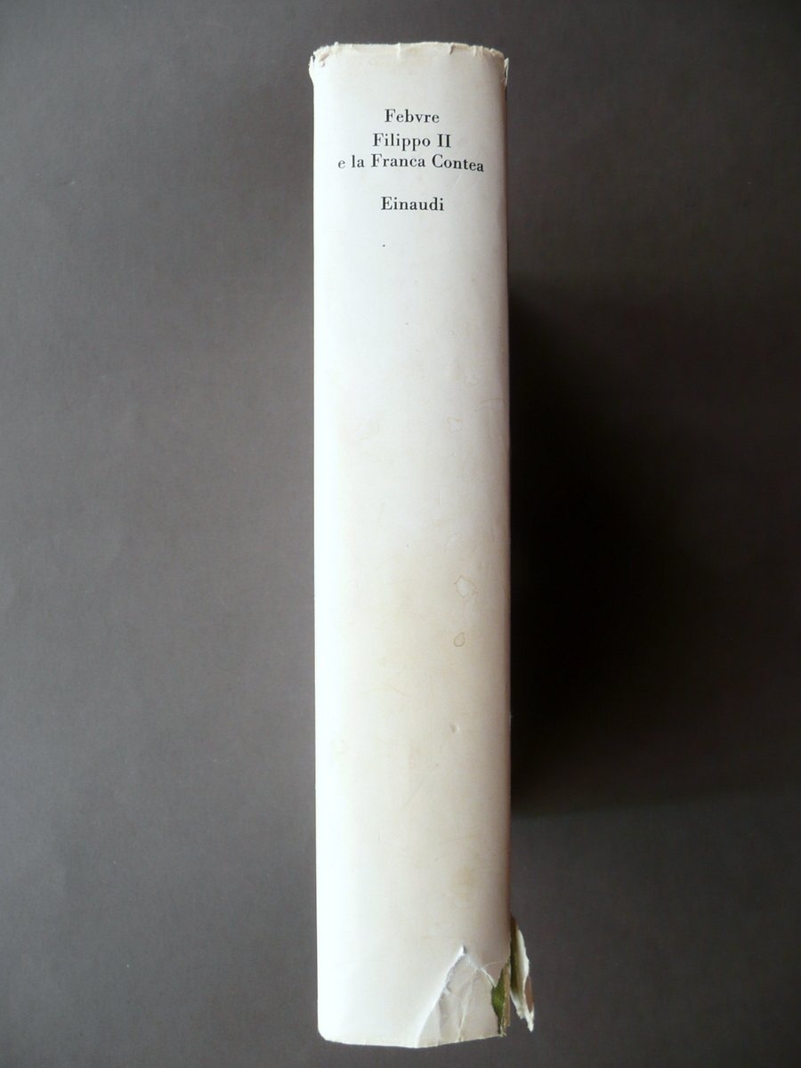 Lucien Febvre, Filippo II e la Franca Contea La lotta fra nobiltà e borghesia nell'Europa del Cinquecento Introduzione di Angelo Torre Presentazione di Fernand Braudel Einaudi, Torino 1979, cm 21,5x15,5, pp. XLIV; 492; tutta tela ed. con titolo al dorso; sovraccoperta ed. ill. a colori. Condizioni di conservazione Esemplare in buone condizioni con tracce d'uso; sovraccoperta ed. applicata alla coperta mediante incollatura di una sua porzione alla cuffia inf., con alcuni minimi graffietti, qualche piccolo strappetto e difetto ai margini e agli angoli (vedi foto). Cerniera ant. della coperta con una minima mancanza all'estremità inferiore. Interni pressoché ottimi. SETT111.L10697 N