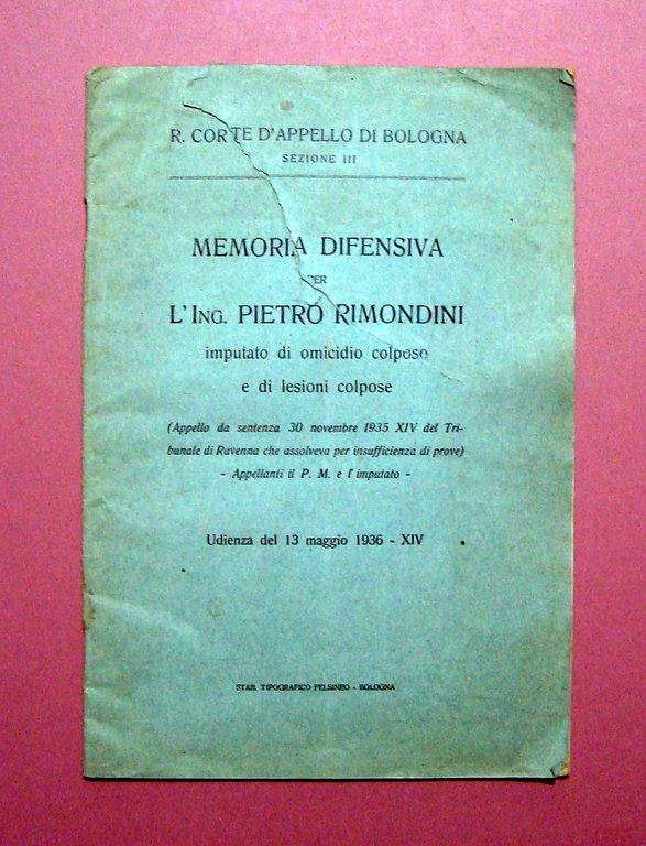 Brossura, Memoria difensiva per L'Ing. Pietro Rimondini Udienza 13 maggio 1936 - XIV Sta. Tip. Felsineo, Bologna, 1936-XIV; cm 30,5x21; pp. 47; fascicoletto Corte d'Appello Bologna. Condizioni di conservazione Esemplare in buone condizioni con tracce del tempo; br. ant con strappo di circa 10 cm con vecchio restauro al retro; interni con leggere bruniture ma buoni. Appello all'assoluzione per l'epidemia di tifo avvenuta nelle scuole comunali di Lugo nel 1933 che causò 3 morti. Interessante ricostruzione storica dell'epidemia di dette scuole e stime dei pozzi. OPEB.5670 blu