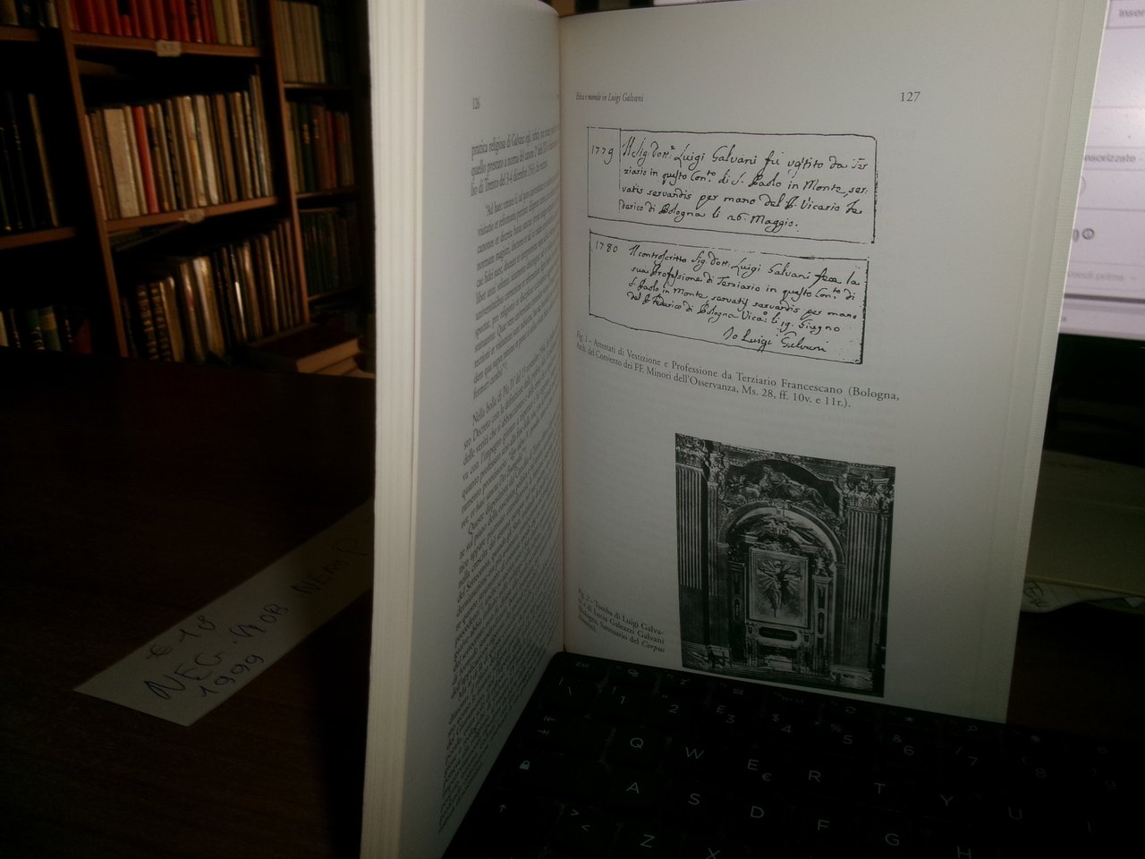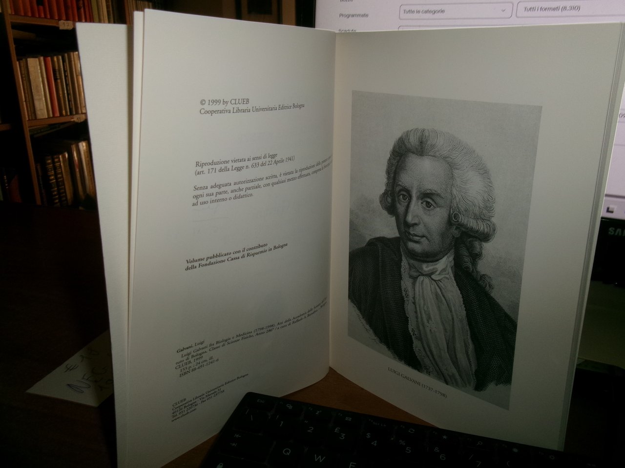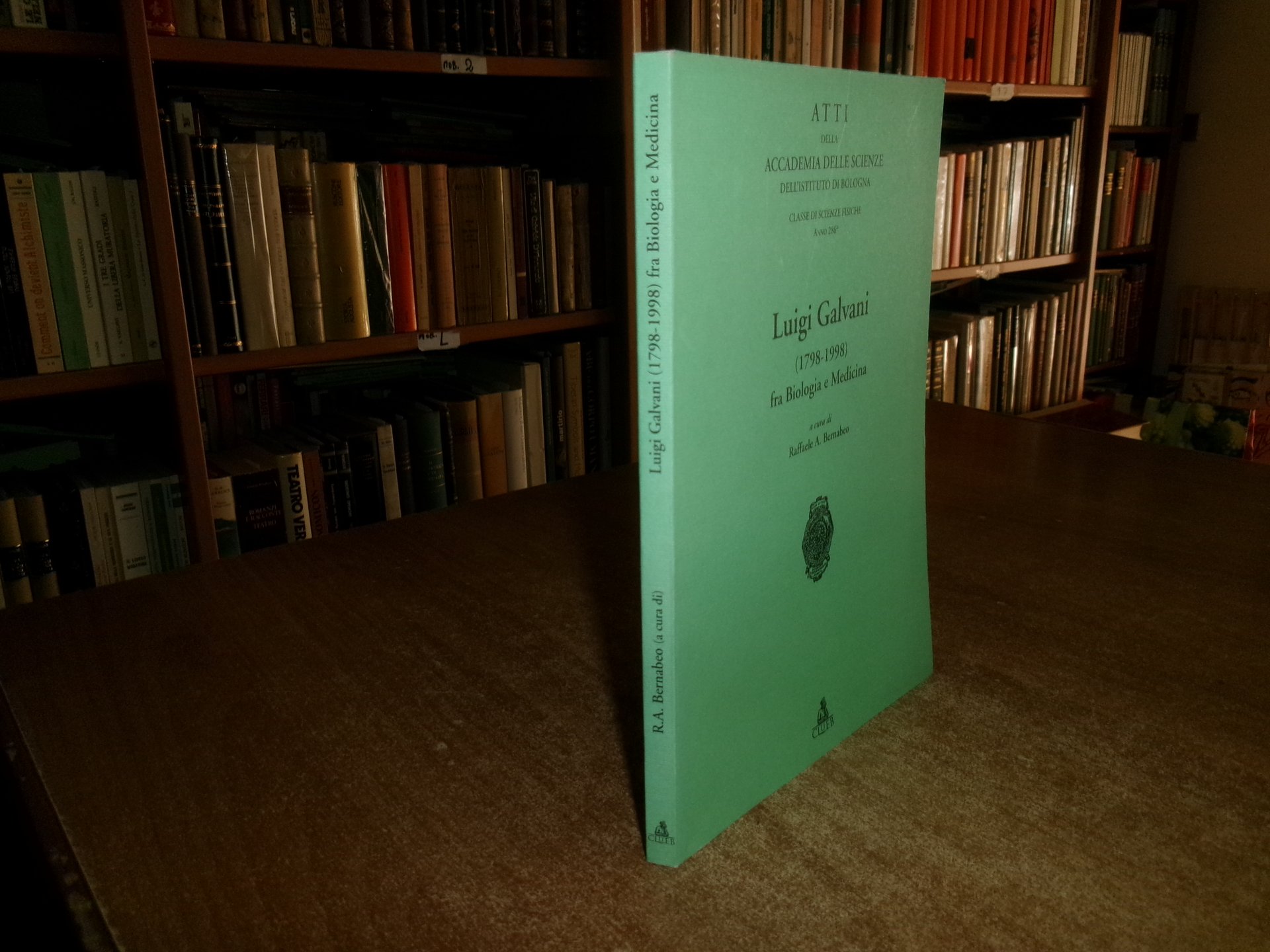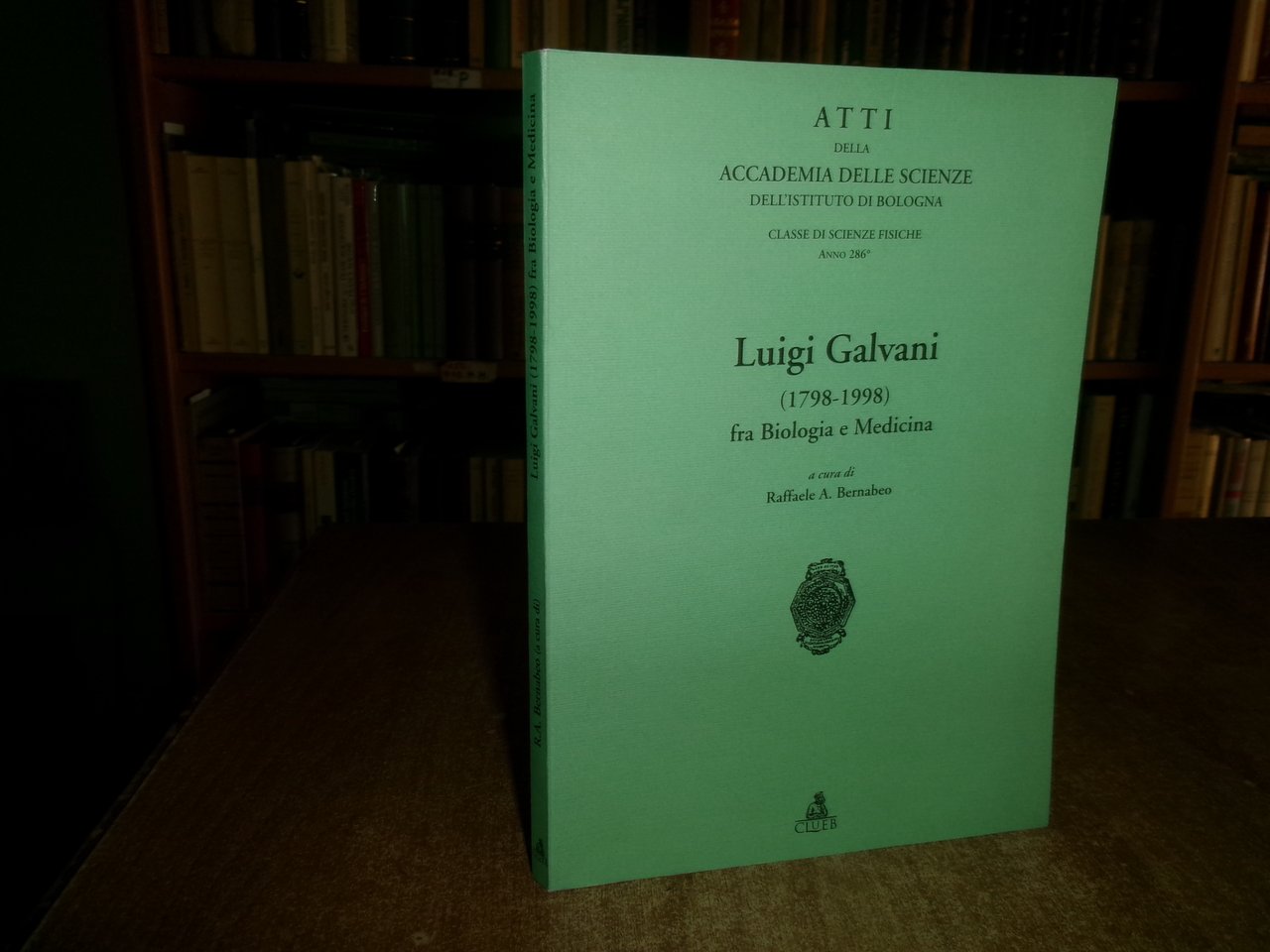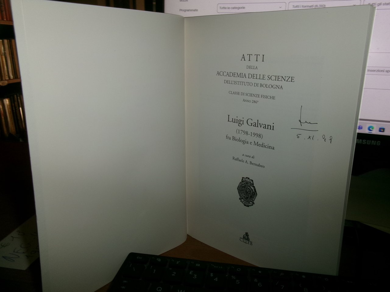 RAFFAELE A. BERNABEO. Bologna, Clueb, 1999. LUIGI GALVANI (1798-1998) fra Biologia e Medicina. In-8°, br. edit. 152 pp. con alcune figure in nero n.t. Ottimo stato con sigla di ex proprietà nel frontespizio. Neg. mob. nero P - P