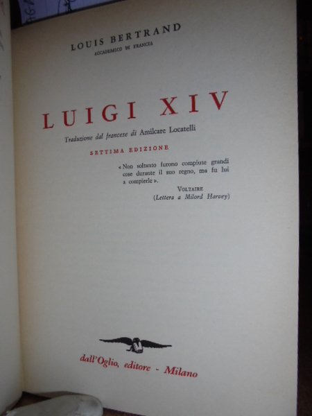 Louis, Bertrand. Milano, dall' Oglio Editore, 1962. LUIGI XIV. Traduzione dal francese di Amilcare Locatelli. Settima edizione. In-8°, cartonato edit. con titolo e fregi in oro al dorso. In buono stato di conservazione. Neg. magazz. scat. 9