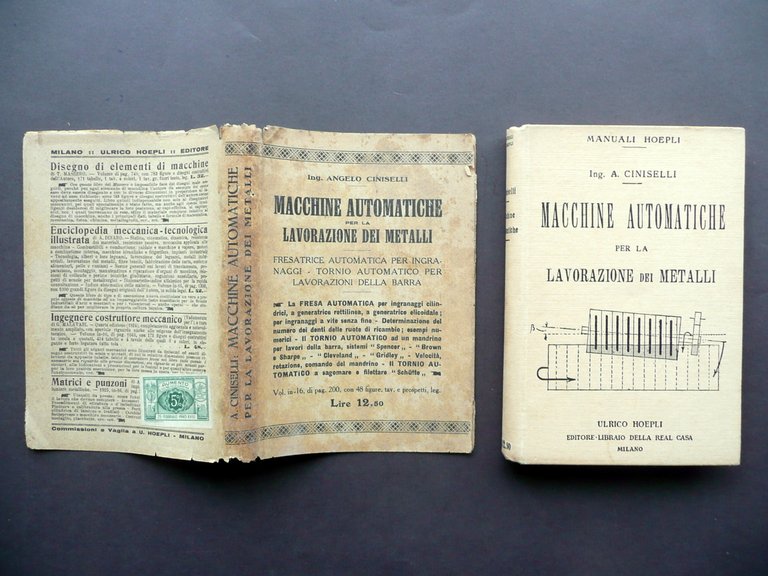 Ing. Angelo Ciniselli, Macchine Automatiche per la Lavorazione dei Metalli Fresatrice automatica per ingranaggi - tornio automatico per lavorazioni della barra con 48 incisioni nel testo Hoepli, Milano 1925, cm 15x10,5, pp. VIII; 198 con 48 fig. in b/n nel t. e fuori t. (una rip. pi√π volte); tutto cartonato ed. con titolo al dorso e al piatto ant., sovraccoperta ed. Condizioni di conservazione Volume ben conservato con tracce d'uso; interni buoni. Sovraccoperta ed. complessivamente ben conservata con alcune bruniture; margini angoli e cuffie con qualche piccolo strappetto e mancanza (vedi foto). Prima edizione (1925), con sovraccoperta editoriale (vedi foto). SETT114.L10893 N P