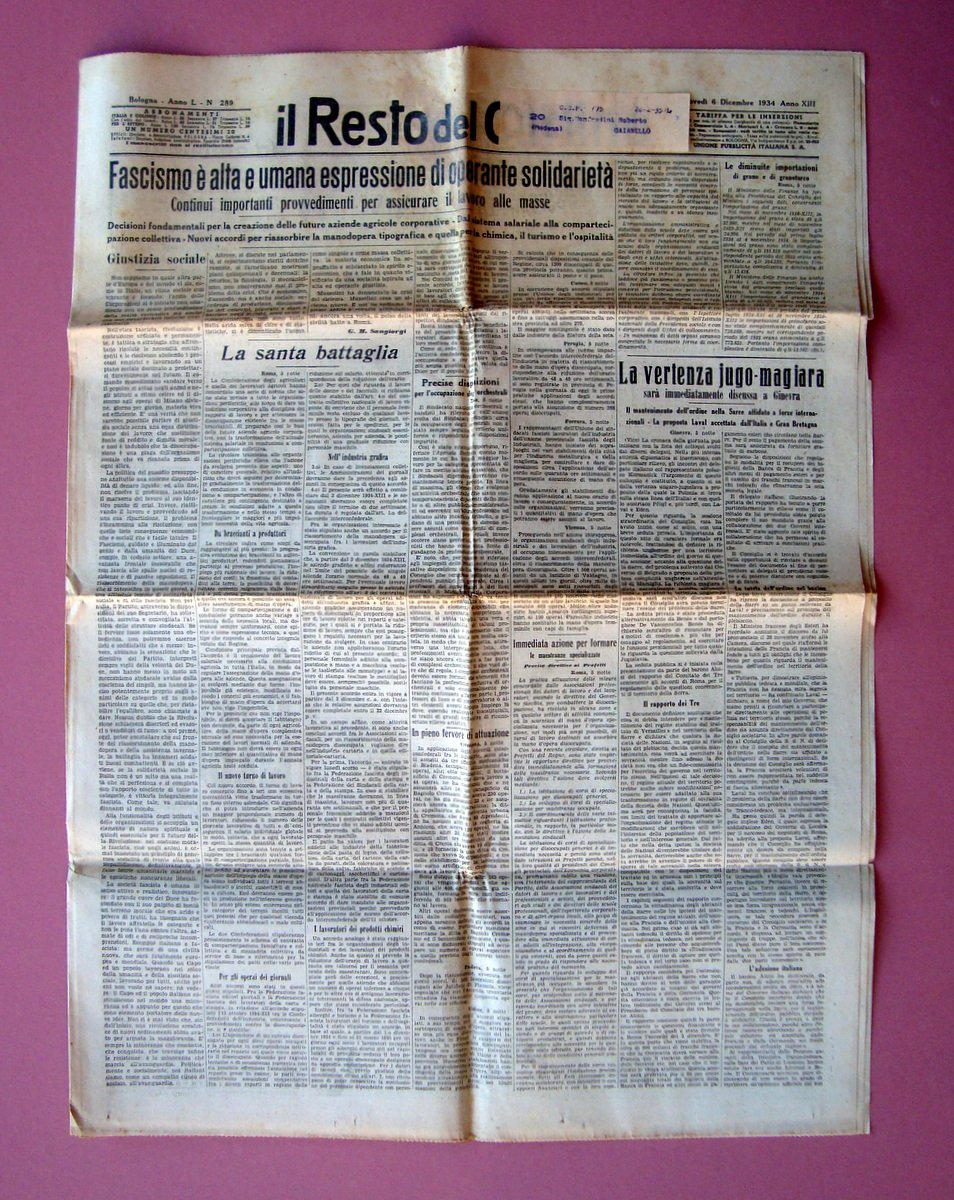 Periodico, Il Resto del Carlino" Anno L N. 289 6 Dicembre 1934 in ultima MACEDONIA EXTRA Bologna, 1934; cm 58x41,5, pp. 8; in ultima grande pubblicità a piena pagina firmata Fontana. Condizioni di conservazione Esemplare in buone condizioni con tracce d'uso e del tempo, pieghe di conservazione che si presentano ingiallite, con piccole mancanze e strappetti, bruniture e macchiette; per le condizioni vedi foto. SC03.D18200 blu "