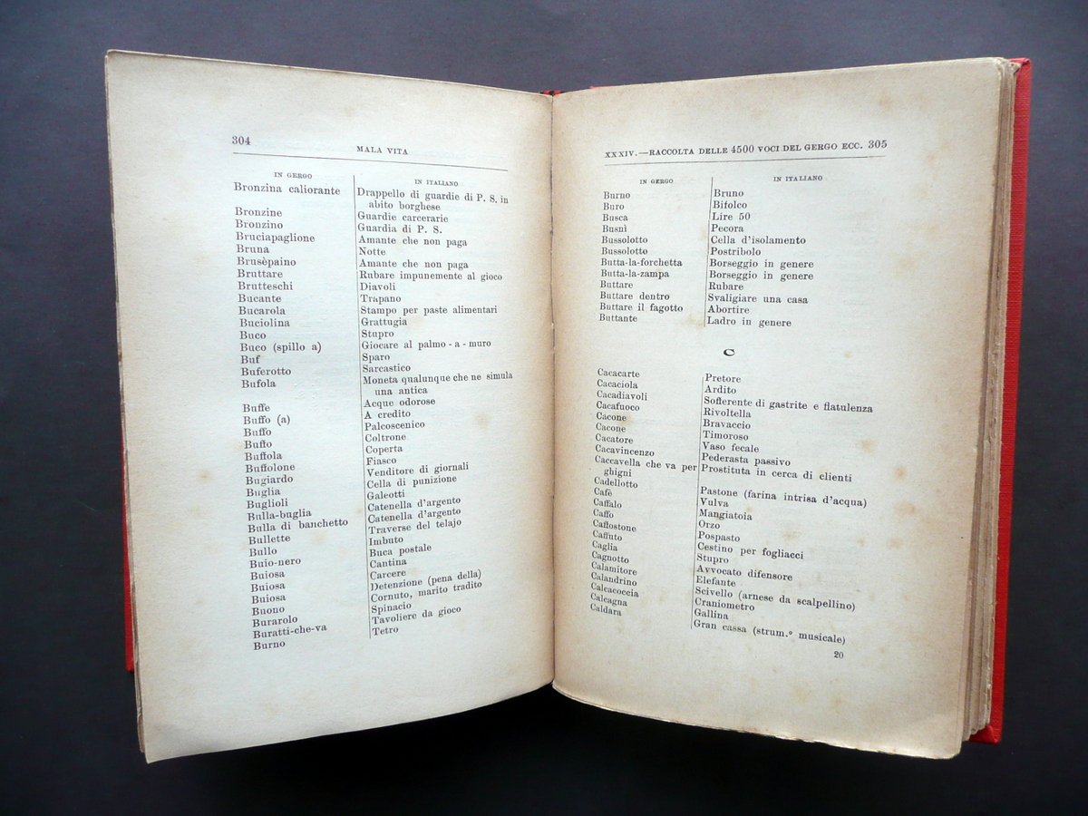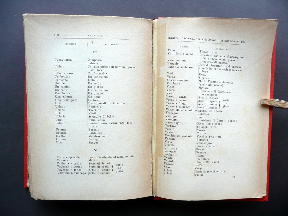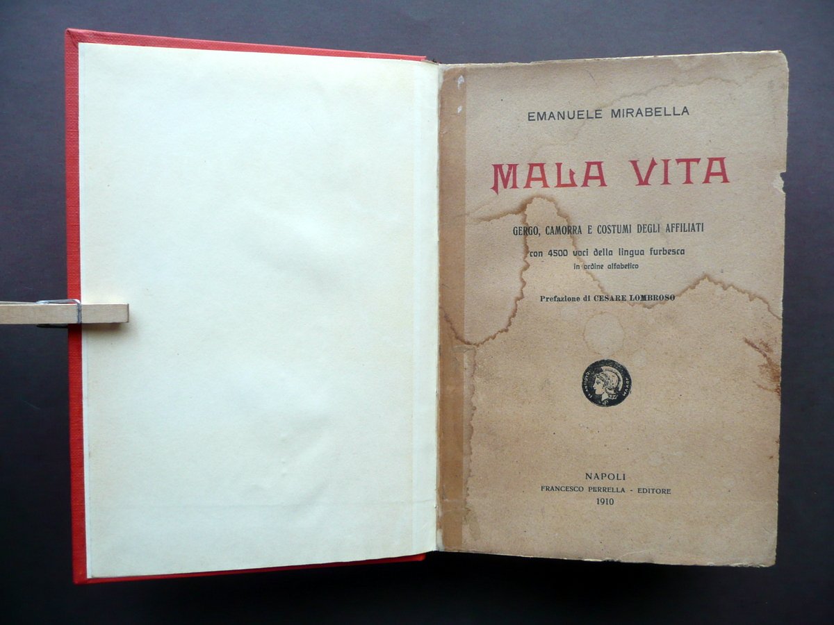 Emanuele Mirabella, Mala Vita Gergo, Camorra e Costumi degli Affiliati con 4500 voci della lingua furbesca in ordine alfabetico Prefazione di Cesare Lombroso Francesco Perrella Editore, Napoli 1910; cm 20x13,5; pp. 408; legatura in tutta tela ed. con titolo in oro entro tassello al dorso; presenza delle brossure ed. originali, ben conservate. Condizioni di conservazioni Coperta in ottime condizioni con minime tracce di utilizzo. Interni complessivamente ben conservati, ancora intonsi, con lievi accenni d'ingiallimento dovuti al tipo di carta e qualche piccola leggerissima brunitura; brossure originali con alcune gore di vecchia umidità che non interessano gli interni; cerniere interne delle brossure e di pagina 401 restaurate mediante nastro adesivo (vedi foto). Rara edizione originale. Prefazione di Cesare Lombroso. SETT131.L13094 N