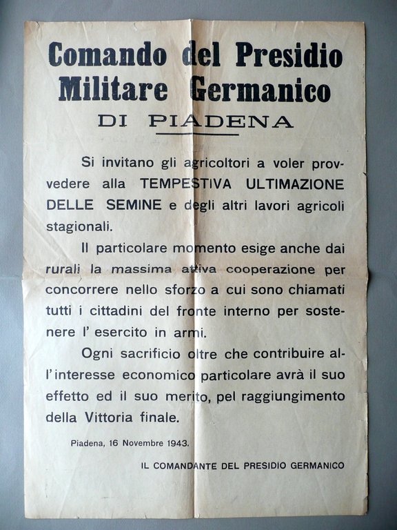 Manifesto Comando Presidio Militare Germanico Piadena Semina 16/11/1943 WW2 | Libri antichi e moderni |