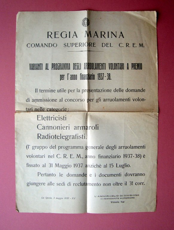 Manifesto, REGIA MARINA .arruolamento volontari a premio per l'anno 1937-38 .categorie. Elettricisti, Cannonieri Armaroli, Radiotelegrafisti La Spezia, 1937; cm 50x35, manifesto a stampa su carta, bianco al retro. Condizioni di conservazione Esemplare in buone condizioni con tracce del tempo, pieghe di conservazione che si presentano ingiallite, con qualche piccolissimo strappetto; margini con bruniture e alcuni minimi strappetti, per le condizioni vedi foto. SC03.D19116 blu
