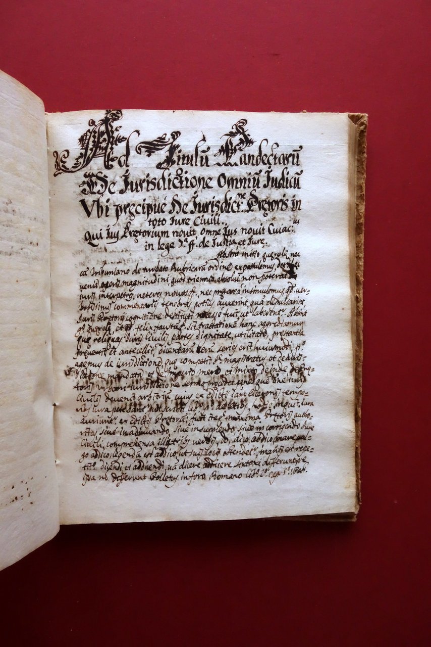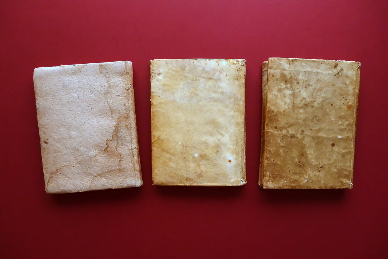 Manoscritto (3 volumi), † Institutionum Canonicarum libri IV" *** "Ad titulus XIX Lib[r]i II Decretalium de Probationibus" *** "Ad titulus Pandectarum De Iurisdictione omnium iudicium ubi precipue de iurisdictione pretoris in toto iure civili [.]" 3 voll.; Napoli, 1735-36; cm 20,5x15,5; pp. 92 (Inst. Canonicarum-I); 1 c. b.; pp. 132 (Inst. Canonicarum-II); pp. 94 (Inst. Canonicarum-III); 1 c. b.; pp.† 120 (Inst. Canonicarum-IV); pp. 116 non num. (Ad titulus XIX Libri II Decretalium [.]); 2 c. b.; pp. 126 non num. (Ad titulus Pandectarum [.]); 1 c. b.; testi interamente manoscritti da un'unica mano. Tre volumi, di cui due con legatura d'epoca in piena pergamena e uno con legatura d'epoca in cartonato; titoli annotati a mano ai dorsi o al piatto anteriore. Testi in latino. † Condizioni di conservazione Volumi tutti in buone condizioni con tracce d'uso e leggeri segni del tempo; coperte con alcune irregolarit‡, piccoli aloni e macchiette, leggere tracce di sporco. Coperta in cartonato con ombre di gore di vecchia umidit‡ che interessano in minima parte i margini di alcune delle prime e ultime pagine. Interni buoni con leggere bruniture; volume contenente i libri III-IV delle Institutionum Canonicarum con parziale fessurazione della cerniera interna anteriore, ma esemplare compatto; prima carta bianca del volume in cartonato con una piccola mancanza al margine inferiore e qualche macchietta per eccesso di inchiostro. † Bel trattato settecentesco di diritto canonico, interamente manoscritto. Oltre ai 4 libri di diritto canonico (vedi foto indici), il terzo volume tratta di ulteriori temi giuridici, approfondendo concetti e disposizioni. In particolare il libro IV tratta di temi quali apostasia, eresie, scomunica, sacrilegi, inquisizione, ecc.†I quattro libri di diritto canonico soni redatti entro i due volumi rilegati in pelle. Il restante testo Ë al terzo volume rilegato in cartonato.†Scrittura abbastanza pulita e leggibile, posata. Testi interamente in latino. † SETT223.L25775 N "