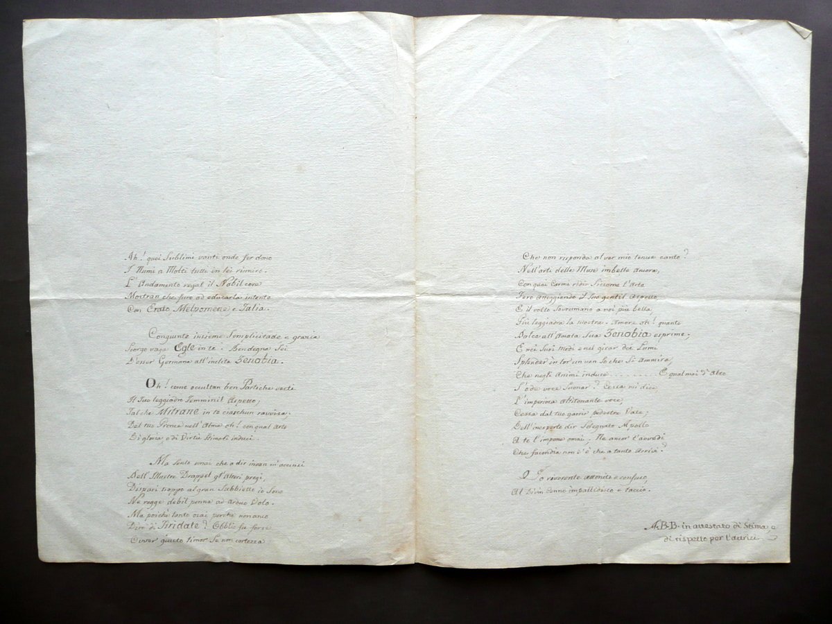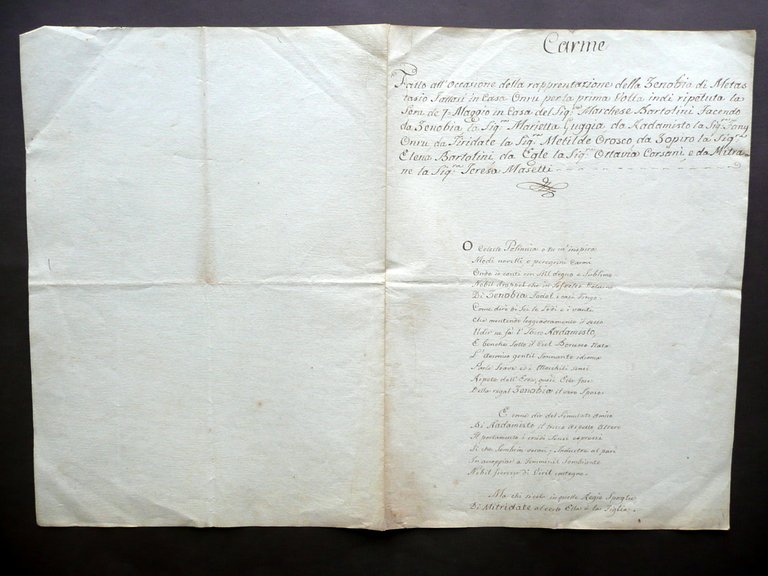 Carme manoscritto, Carme Fatto all'occasione della rappresentazione della Zenobia di Metastasio fattasi in Casa Onru per la prima volta, indi ripetuta la sera del 7 maggio in casa del Sig. Marchese Bartolini facendo da Zenobia la Sig.ra Marietta Guggia, [.]" S. d. (primo Ottocento circa); carme interamente manoscritto su bifolio in carta; testo disposto su tre facciate. Cm 29,5x21. Condizioni di conservazioni Esemplare ben conservato con tracce d'uso, lievi pieghe di conservazione, alcune piccole / minime leggere bruniture e qualche lievissimo alone. SC03.D12604 N "