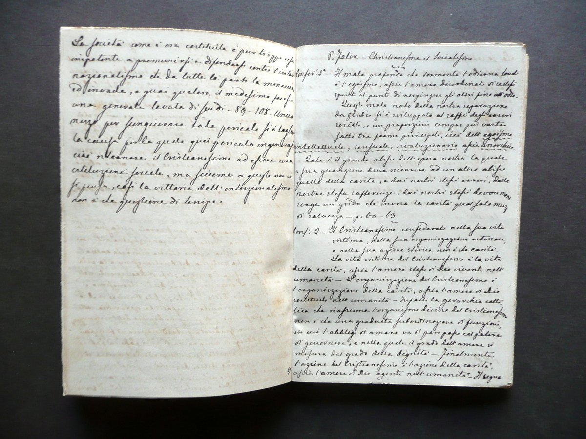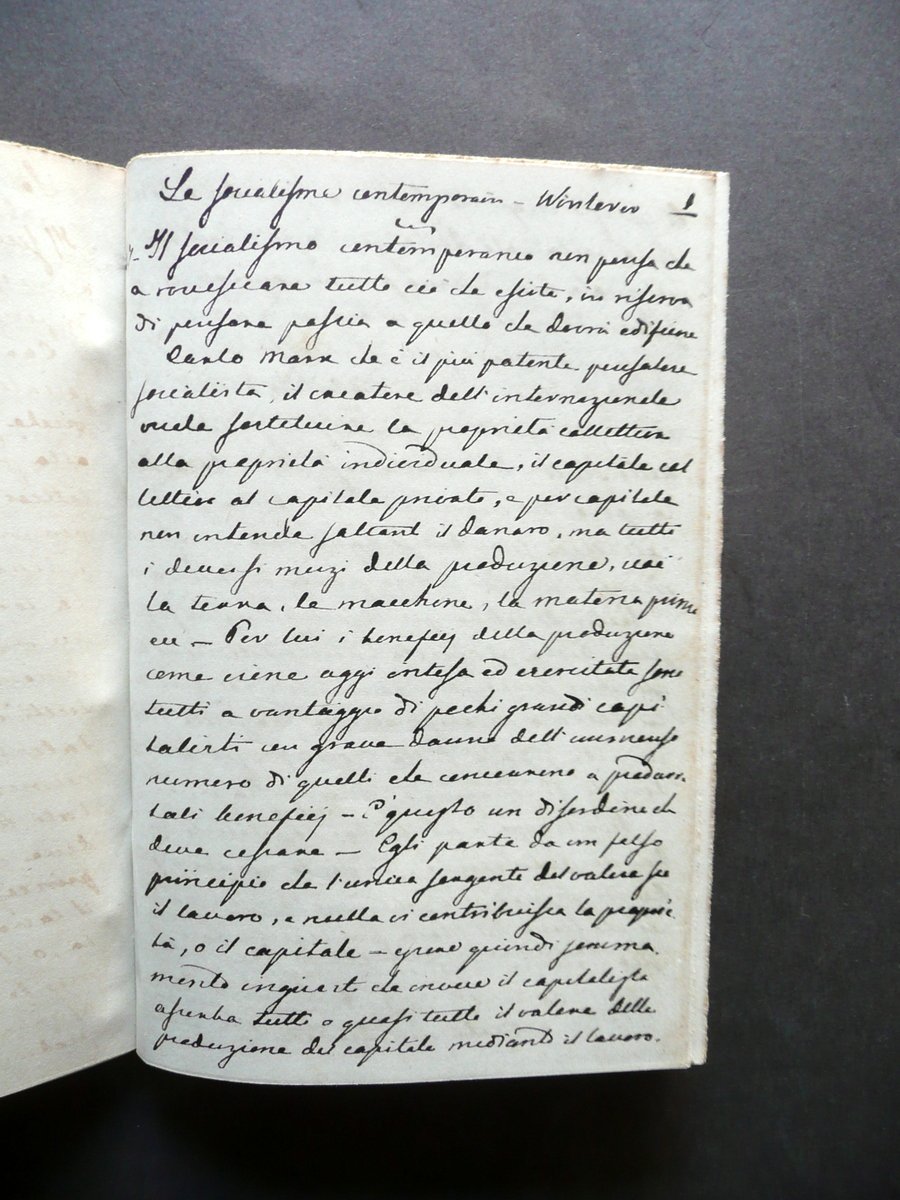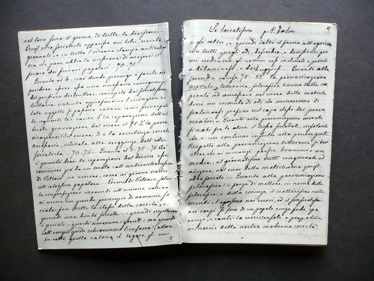 Trattato manoscritto, † Sur le Socialisme S. d. (1870-80 circa); cm 15,5x10,5; pp. non num. (pp. 96), tutte interamente manoscritte; mancanza della legatura ma esemplare compatto grazie a tracce della precedente legatura al dorso (vedi foto). Titolo e sottotitoli in francese, ma testo in italiano. † Condizioni di conservazione Esemplare ben conservato con tracce d'uso, mancanza della legatura ma esemplare complessivamente compatto grazie a tracce della precedente legatura al dorso (vedi foto), angolo inf. di qualcuna delle ultime pagine con lieve accenno di piega. Alcune piccole lievi bruniture principalmente ai tagli. Primo fascicolo quasi completamente staccato dal corpo del testo (vedi foto). † Titolo e sottotitoli in francese, ma testo in italiano. † OPEB.3558 N