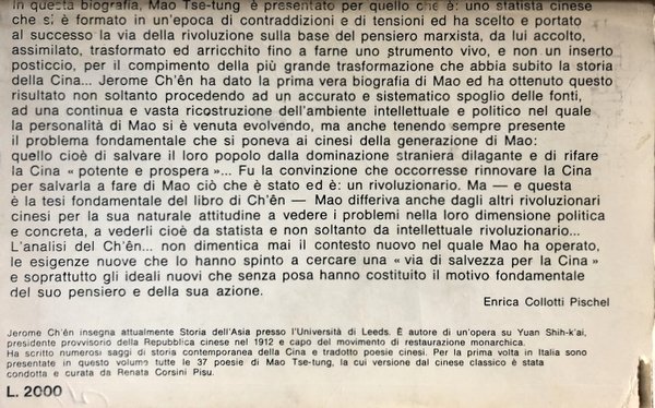 In questa biografia, Mao Tse-Tung è presentato per quello che è: uno statista cinese che si è formato in un epoca di contraddizioni e di tensioni ed ha scelto e portato a successo la via della rivoluzione, sulla base del pensiero marxista, da lui accolto, assimilato, trasformato ed arricchito fino a farne uno strumento vivo, e non un inserto posticcio, per il compimento della più grande trasformazione che abbia subito la storia della Cina. Jerome Ch'en ha dato la prima vera biografia di Mao ed ha ottenuto questo risultato non soltanto procedendo ad un accurato e sistematico spoglio delle fonti, ad una continua e vasta ricostruzione dell'ambiente intellettuale e politico nel quale la personalità di Mao si è venuta evolvendo, ma anche tenendo sempre presente il problema fondamentale che si poneva ai cinesi della generazione di Mao, quello cioè di salvare il loro popolo dalla dominazione straniera dilagante e di rifare a Cina potente e prospera. Fu la convinzione che occorresse rinnovare la Cina per salvarla a fare di Mao ciò che è stato ed è un rivoluzionario. Ma - e questa è a tesi fondamentale del libro di Ch'en - Mao differiva anche dagli altri rivoluzionari per la sua naturale attitudine a vedere i problemi nella loro dimensione politica e concreta, a vederli cioè da statista e non soltanto da intellettuale rivoluzionario. L'analisi del Ch'en non dimentica mai il contesto nuovo nel quale Mao ha operato, le esigenze nuove che lo hanno spunto a cercare una via di salvezza per la Cina e soprattutto gli ideali nuovi che senza posa hanno costituito il motivo fondamentale del suo pensiero e della sua azione.
