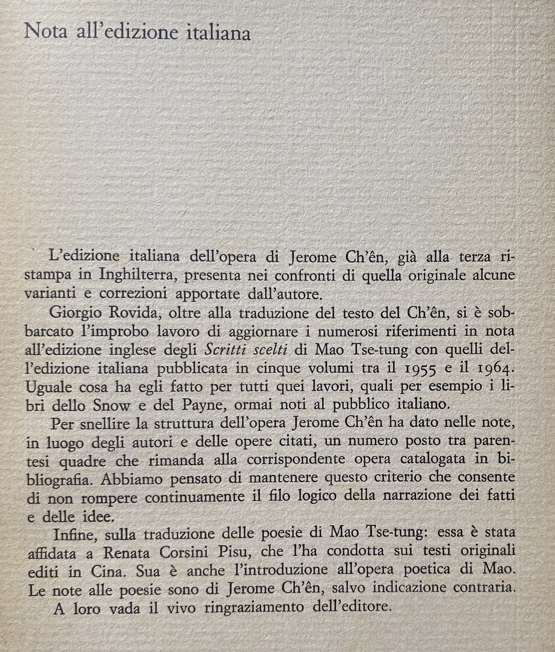 Soggetti: Storia contemporanea, Maoismo, Sinologia Asia, Marxismo, Pensiero politico, Pechino, Statisti cinesi, Personaggi storici illustri, Saggi, Novecento, Comunismo, Rivoluzione cinese, Cina Terza Via Socialismo Rivoluzione culturale Grande balzo Mao Zedong Biografie Politica estera Relazioni internazionali Unione Sovietica, Riforma agraria, Lunga Marcia, Burocrazia, Partito comunista, Confucianesimo, Sinologia, Guerre Giappone Manciuria Russia Feudalesimo Economia, Capitalismo, Grande Timoniere, Society and Culture, Stalin, Classici, Storiografia, Nanchino Esercito popolare di liberazione, Discorsi, Manifesto, Fonti, Bibliografia, Contadini, Campagne, Shaanxi, Nemici, Libri vintage fuori catalogo Contemporary History, Political Thinking, Beijing, Statesmen, Famous Historical Figures, Essays, Twentieth Century, Communism, Chinese Revolution, China, Third Way, Socialism, Cultural Revolution, Great Leap, Biographies, Foreign Policy, International Relations, Union Soviet, Agrarian Reform, Long March, Bureaucracy, Communist Party, Confucianism, Sinology, Wars, Japan, Manchuria, Russia, Feudalism, Economy, Capitalism, Great Helmsman, Classics, Historiography, Nanjing, Yellow Crane, People's Liberation Army, Speeches, Sources, Bibliography, Peasants, Campaigns, Enemies, Out of print books Collectibles Stalin People's Daily Contadini Campagne Alfabetizzazione Analfabetismo Lingua Krusciov 28 Bolscevichi André Malraux Quadri Marxismo Proletariato Lotta di classe Guardie rosse Industrie Produzione Burocrazia Borghesia Confucio Confucianesimo Religione Tradizione Kang Sheng Kim Il Sung Corea Tattica Americani Trattative Fukien Chingkang Doppio Nove Gru Gialla Tapoti Grotta degli Immortali Peitaiho Kuo Mo-jo Anni trenta Anni Quaranta Anni Cinquanta Poetica Robert Payne Guerra civile Taiping Rivolte Boxer Benjamin Schwartz Rise Wittfogel Fairbank Engels Lenin Stuart Schram Internazionale Liberalismo Stella rossa Vita privata Potere Oriente Li Hui Hsiao San Tso-Liang Nazionalismo Fiume Governo Agnes Smedley Gran Bretagna Inghilterra Francia Resistenza Oppositori Taiwan Collettivizzazione PCC Zhongnanhai Riforma agraria Cento fiori Scrittura semplificata Agricoltura Massacro Guangxi Agosto Lin Biao Tienanmen Culto della personalità Jiang Qing Tigri di carta Contraddizioni Crtica Anna Louise Strong Pensiero politico E. Krieg Jasper Becker Jung Chang Harry Wu Zhang Xianliang Grande carestia Filosofia marxista Lavoro Laogai Insurrezione Soviet Brandt 4 Maggio Chairman 1st Front Army Corps attack August base areas battle campaign Canton Central Committee Ch'angsha Tu-hsiu Yi Chang Kuo-t'ao Chiang Kai-shek China Chinese Chingkangshan Chou En-lai Chungking Comintern command communists Conference congress defeat democratic Division Eighth Route Encirclement enemy Feng fighting forces Fourth Fukien guerrilla Hsiang Hsiao Huang Hunan Hupei Jinggangshan Jiang Qing Jiangxi Japan Japanese Kiangsi KMT troops Kuomintang Kwangtung leaders Li-san Lin Piao Liu Po-ch'eng Long March Manchuria Nanch'ang Nanking north Shensi P'eng Te-huai party peasant movement Politburo political province Red Army Regiment revolution revolutionary River Route Russian Shanghai Siao Yu soldiers strategy Sun Yat-sen SW IV Peking Szechwan Taiping Rebellion T'ang Ta-chao Teng Ts'ai Tung united front Wang Ching-wei warlords workers Wuhan Yenan Yuan sinology