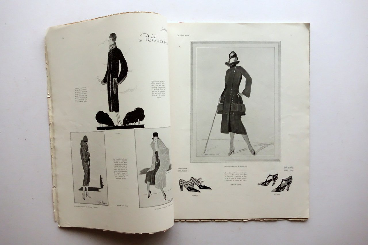 Rivista, Sogno d'Azzurro" acquarello originale di Marcello Dudovich (abito e mantello di Marta Palmer) realizzato mediante la tecnica del pochoir in "La Donna" rivista d'arte e di moda anno XXI - gennaio 1925 Ed. Mondadori, 1925; cm 32x24,5; pp. IV-72 con numerose belle ill. in b/n e a colori nel t. e fuori t., più una bellissima tavola originale del Dudovich colorata ad acquarello (vedi foto); brossura ed. con bella grafica a colori di copertina di Mario Cito Filomarino; quarta di copertina con bella ill. pubblicitaria a colori di M. Dudovich. Numero completo. Condizioni di conservazione Complessivamente in buono stato con tracce d'uso, brossura sgualcita con alcuni minimi marginali strappetti e mancanze; brossura post. con alcuni lievi graffietti e minime abrasioni; brossura ant. con traccia di piega. Dorso con tre piccole mancanze, esemplare compatto. Interni buoni con alcuni pressoché trascurabili aloni; minime bruniture a qualche pagina. Pregevole rivista di moda, con bellissimo acquarello originale del Dudovich (abito e mantello di Marta Palmer), realizzato con la tecnica del pochoir: tale tecnica, di derivazione francese, consiste nel realizzare la colorazione di un modello / disegno attraverso l'uso di mascherine ritagliate in base alle sezioni che si desiderano colorare. Anche belle illustrazioni di Brunelleschi, Sto, Gordon Canway; altre del Dudovich. Numero è completo. Illustrazione alla quarta di copertina anch'essa del Dudovich. SETT199.L24459 N "