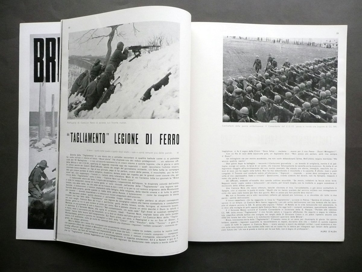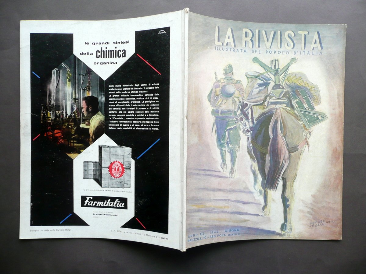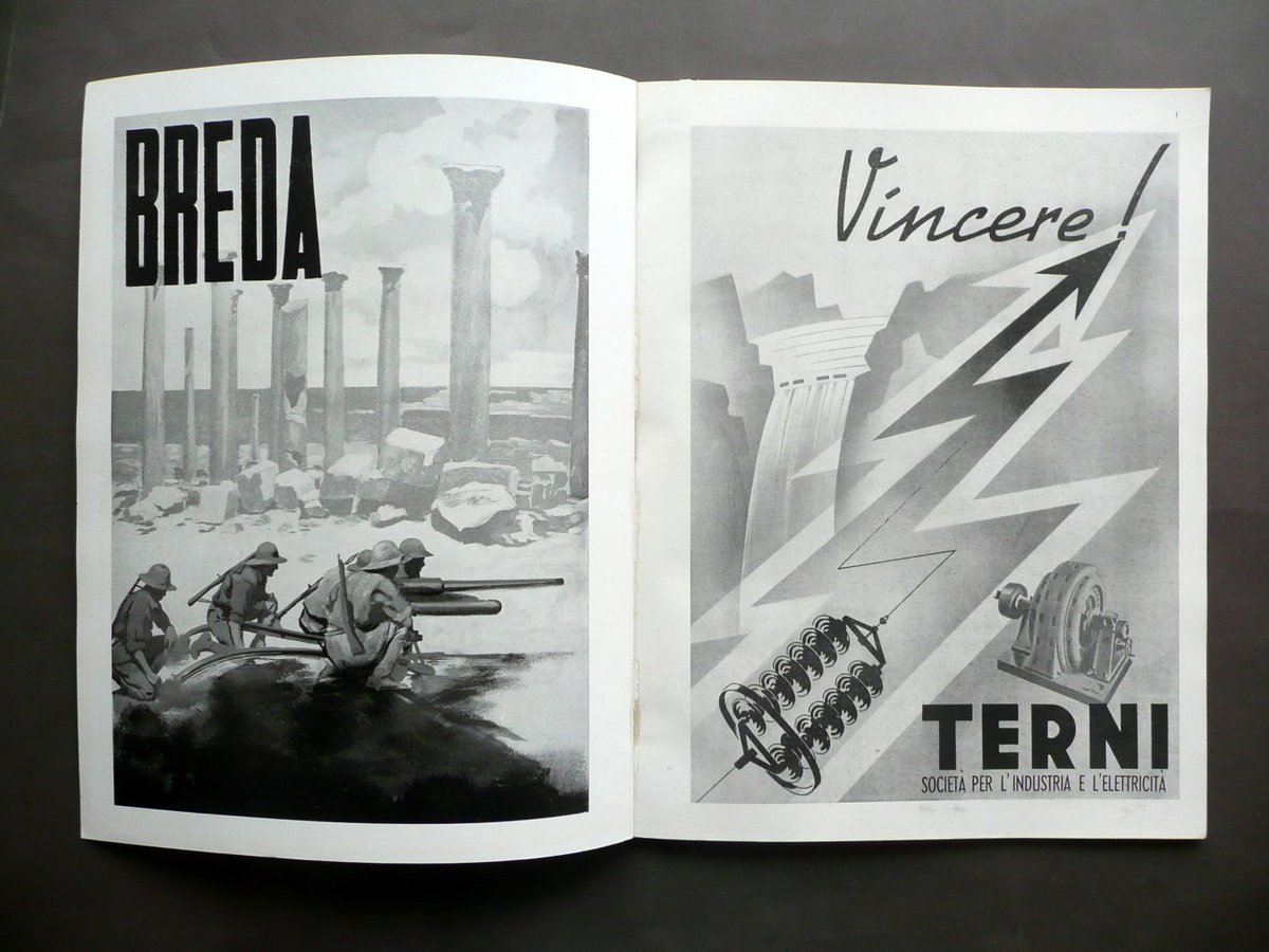 Rivista, Gli aeropoemi futuristi della guerra mussoliniana Le vigne romane di S. Eurosia acclamano i trionfatori" Di F. T. Marinetti e "Tagliamento Legione di Ferro" in "La Rivista Illustrata del Popolo d'Italia" Anno XX - Numero 6 - Giugno 1942 Milano 1942; cm 33,5x26,5; pp. 64 con numerose ill. fotogr. in b/n nel t. e fuori t., e con qualche inserzione pubblicitaria in b/n fuori t.; brossura ed. ill. a colori (bella grafica di copertina). Numero completo. Condizioni di conservazione Esemplare ben conservato con tracce d'uso, brossura post. e dorso con lievi accenni di sporco, cuffia sup. con un minuscolo strappetto. Interni buoni. Interessante numero edito in pieno periodo bellico, che a pagina 29 presenta l'areopoema futurista sopra citato. Le pagine 22-23 sono invece dedicate all'articolo sulla Legione di Ferro 'Tagliamento' (vedi foto). In apertura anche due belle inserzioni pubblicitarie d'epoca della Breda e della Società per l'industria e l'elettricità 'Terni' (propagandistiche come d'uso allora). Numerose interessanti notizie e illustrazioni fotografiche di operazioni belliche sui principali fronti di guerra. Numero completo. RVS001N00138 N "