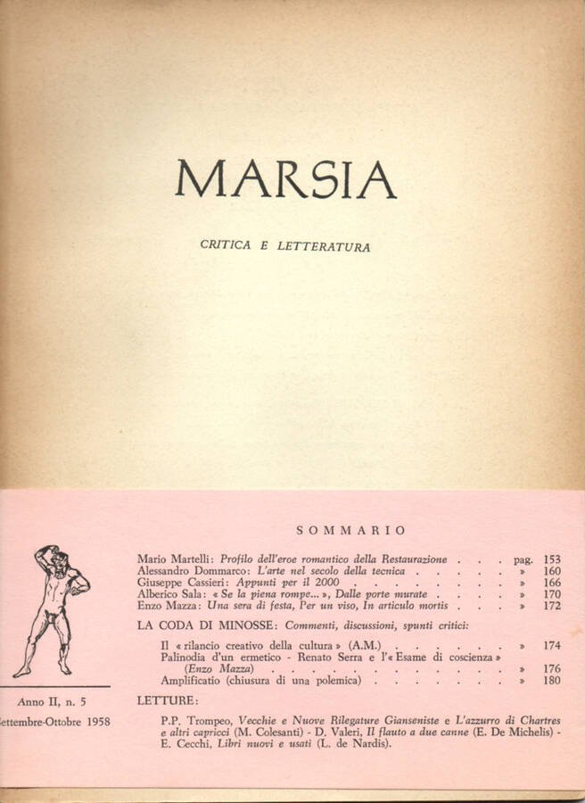 Buono stato, fascetta editoriale originale in carta in ottimo stato, coperta illustrata in cartoncino, margini di piatti e pagine, dorso e tagli poco bruniti. N. 5, Anno II, settembre-ottobre 1958 del periodico Marsia - Rivista bimestrale di Critica e Letteratura, diretta e redatta da: Manlio Barberito, Luigi de Nardis, Alessandro Dommarco, Ariodante Marianni, Enzo Mazza. Numero Pagine 35