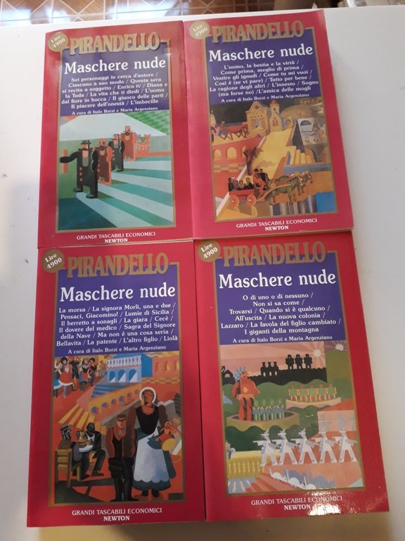 Libri in brossura. Usati tenuti bene.Opera completa : I,Sei personaggi in cerca d'autore /Ciascuno a suo modo /Questa sera si recita a soggetto /Enrico IV / Diana e la Tuda / La vita che ti diedi /l'uomo dal fiore in bocca / Il guoco delle parti / Il piacere dell'onesta' / L'inìmbecille. II, L'uomo la bestia e la virtu' /Come prima,meglio di prima / Vestire gli ignudi /Come tu mi vuoi /Cosi e'( se vi pare ) / tutto per bene / La ragione degli altri /l'innesto / Sogno ( ma forse no ) /L'amica delle mogli. III,La morsa / La signora Morli , una e due / Pensaci ,Giacomino / Lumie di Sicilia / Il berretto a sonagli /La giara / Cece' / Il dovere del medico /Sagra del signore della nave / Ma non e' una cosa seria /Bellavita /La patente /L'altro figlio / Liola'. IV, O di uno o di nessuno / non si sa come / Trovarsi / Quando si e' qualcuno / All'uscita / La nuova colonia / Lazzaro / La favola del figlio cambiato / I giganti della montagna