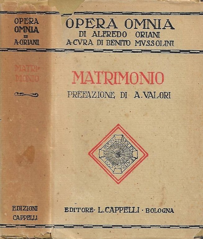 Volume rilegato con titoli al piatto anteriore e al dorso, coperta cartonata e con lievi irregolarità ai margini, sovraccoperta segnata da fattore tempo e maggiormente imbrunita al dorso. Tagli regolari, imbruniti e con il superiore spruzzato a colori, pagine ben salde alla costa e con imbrunitura. Libro completamente fruibile, n. 8 della collana "Opera Omnia di Alfredo Oriani" curata da Benito Mussolini, con prefazione di Aldo Valori, terza edizione, numero pagine 433 (XX, 413)