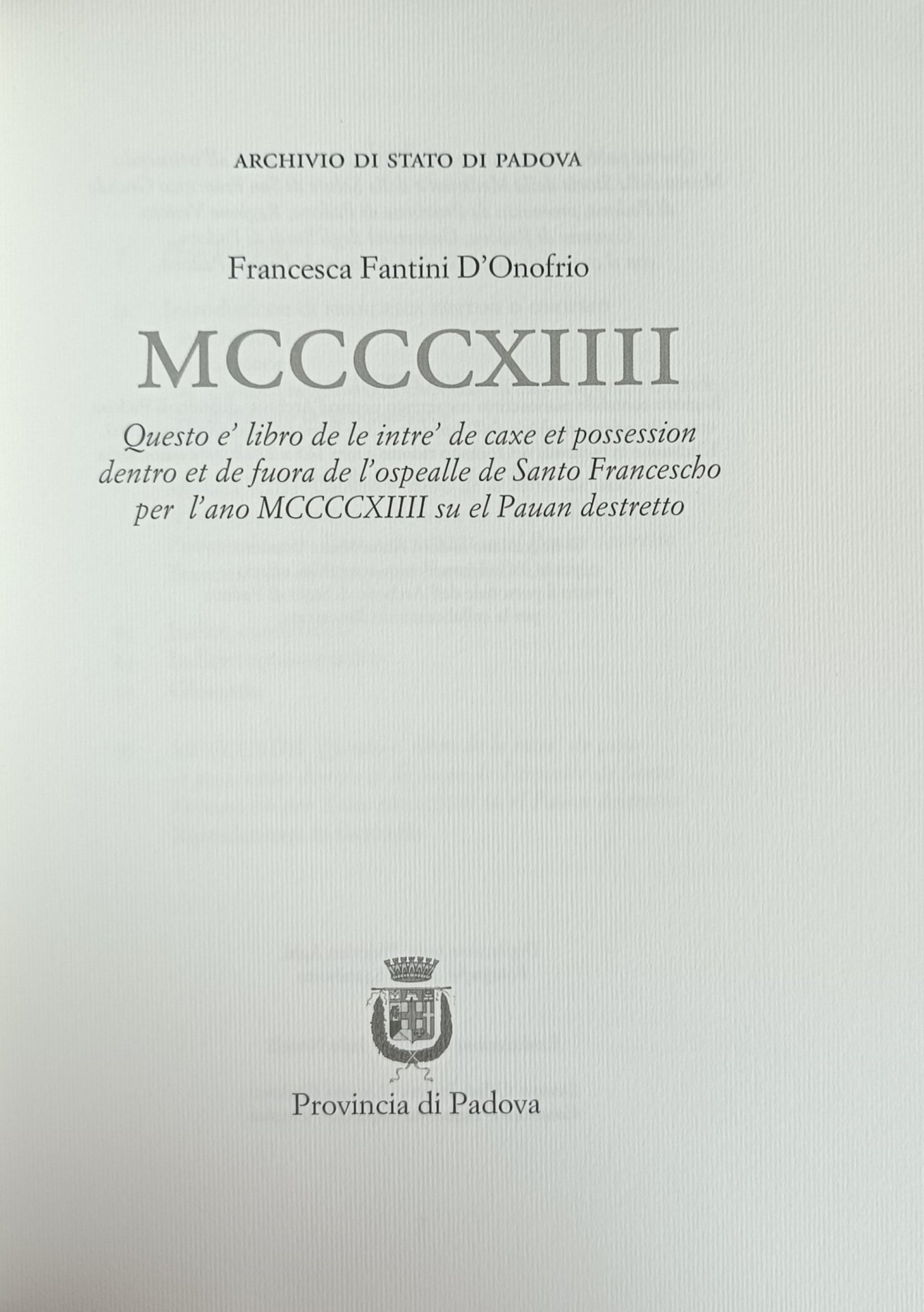 "Questo é libro de le intré de caxe et possession dentro et de fuora de l'ospealle de Santo Francesho per l'ano MCCCCXIIII su el Pauan destretto".