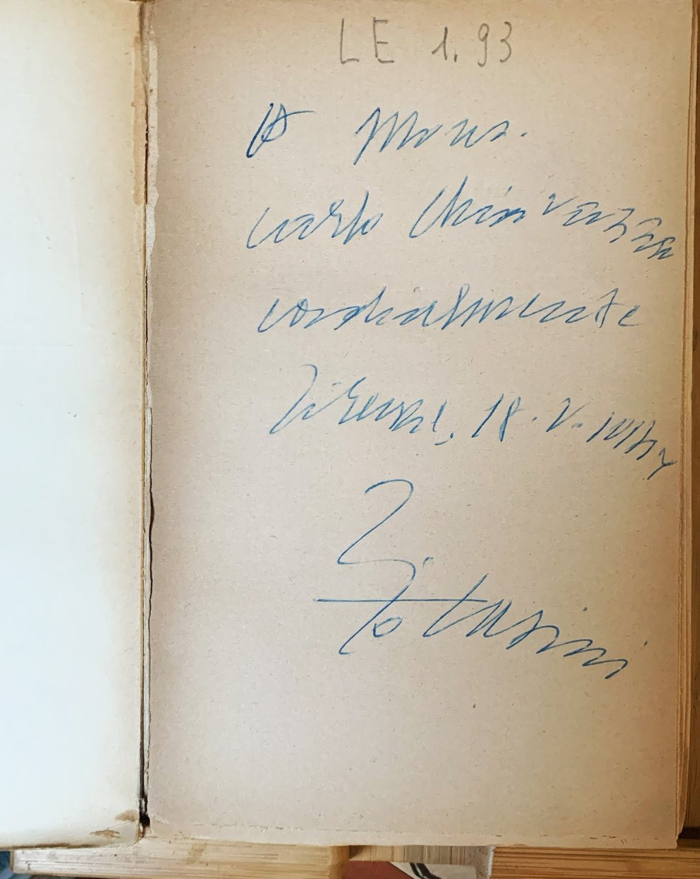 I ed.. XVI grande/ 168/ brossura in cartoncino liscio avorio con titoli in nero e rosso e con incisione in nero al primo piatto. Con dedica a penna blu a dell'A. a p. 1, pagina non stampata). Stato buono (copertina usurata ai margini - brunitura della copertina, in particolare al dorso e ai margini - etichetta dda catalogazione applicata nella parte inferiore del dorso che sborda ai piatti - parzialmente intonso - timbri bibliotecari annullati - pagine brunite, in particolare ai margini). Indice: Romagna solatìa - "Fenesta che lucive" - Libertà van cercando -Pro afflictis et captivis - 1^ aprile 1944 - Addio a Firenze - "Sicut oves occisionis" - Umanità - Il "nostro" Gesù - Il centro e l'ala - Rosa - Una cannonata - L'inizio - "Meticcina!" - Pelle per pelle - "Passarono gli areoplani" - Cure governative - Il "morale" - Aspri pensieri - Troglodi - "De laqueo venantium" - Le vie dela Provvidenza - "Fünfte Kompagnie" - Roncopiano - Vittoria
