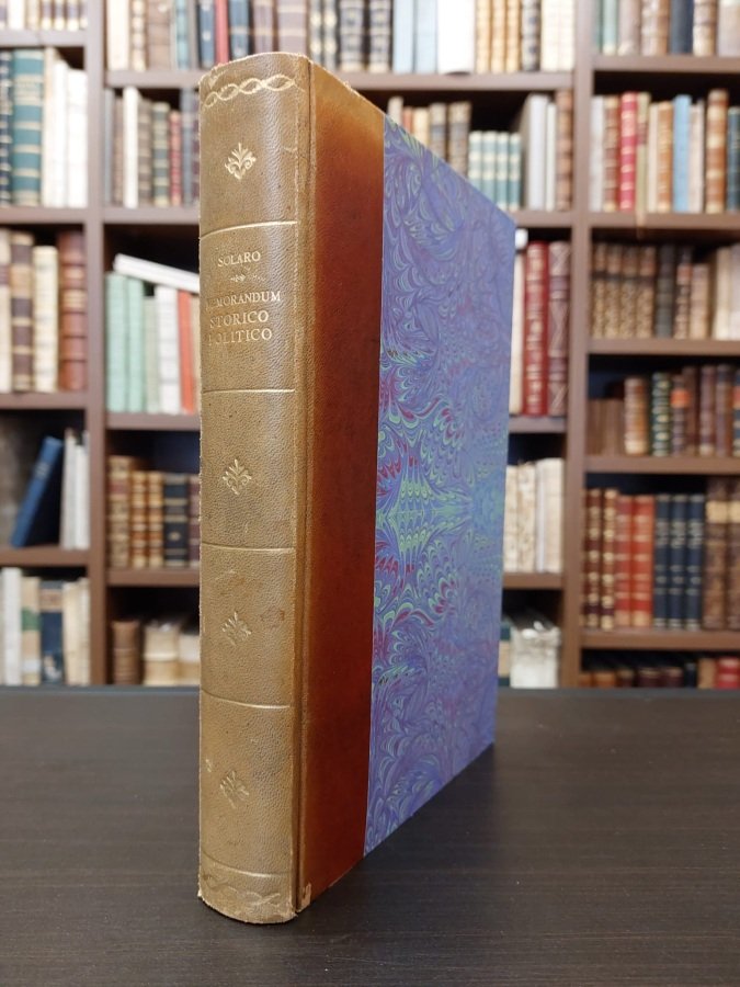 In-8° (cm. 24,5), legatura successiva in mezza pelle con titolo, fregi e filetti sempre in oro al dorso (brunito), conservata la brossura editoriale a stampa blu con titolo in nero inquadrato da cornice tipografica al piatto anteriore e fregio silografico a quello posteriore (alcuni difetti); pp. VIII 586 in barbe, in stato molto buono (lievi e sporadiche fioriture). Prima edizione di questo fondamentale documento storico della politica e della diplomazia piemontese dal 1835 al 1847, periodo in cui il Solaro Della Margarita ricoprì la carica di Ministro e Primo Segretario di Stato per gli Affari Esteri del Regno di Sardegna e che qui ripercorre quasi giorno per giorno. Contro l'intervento in Lombardia e contro l'esercito austriaco. Cfr. Rosi IV, 307-309; Bertarelli 2122. Buon esemplare. (NH6)