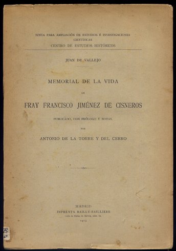 Memorial de la vida de Fray Francisco Jiménez de Cisneros. Publicado, con prólogo y notas por Antonio de la Torre y del Cerro. | Libri antichi e moderni | Vallejo, Juan De.
