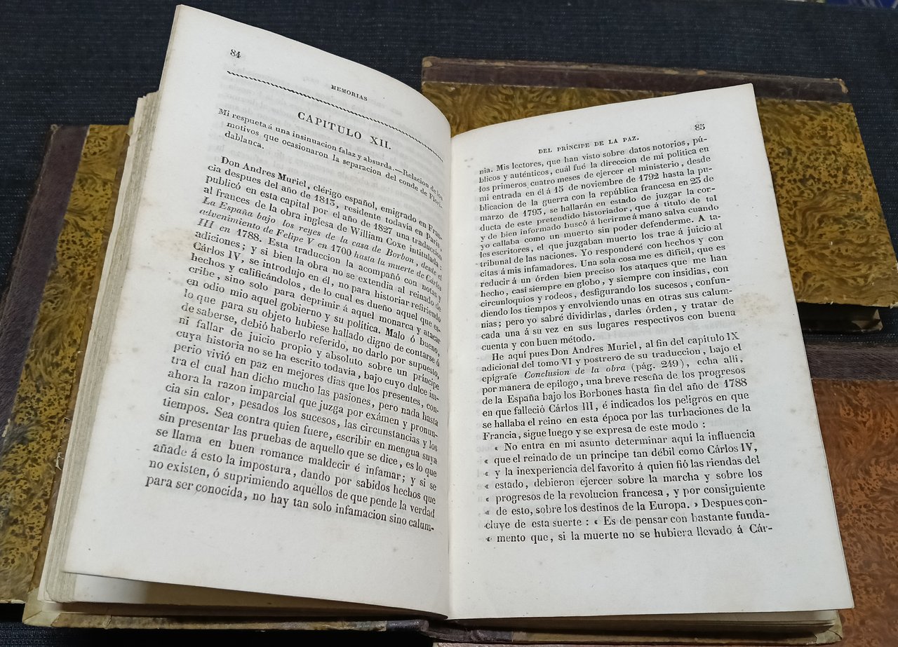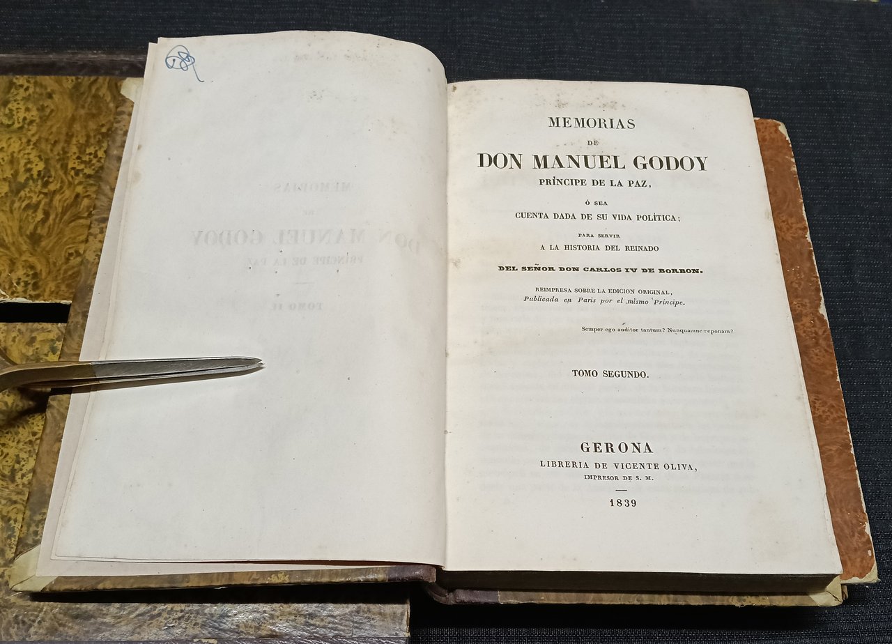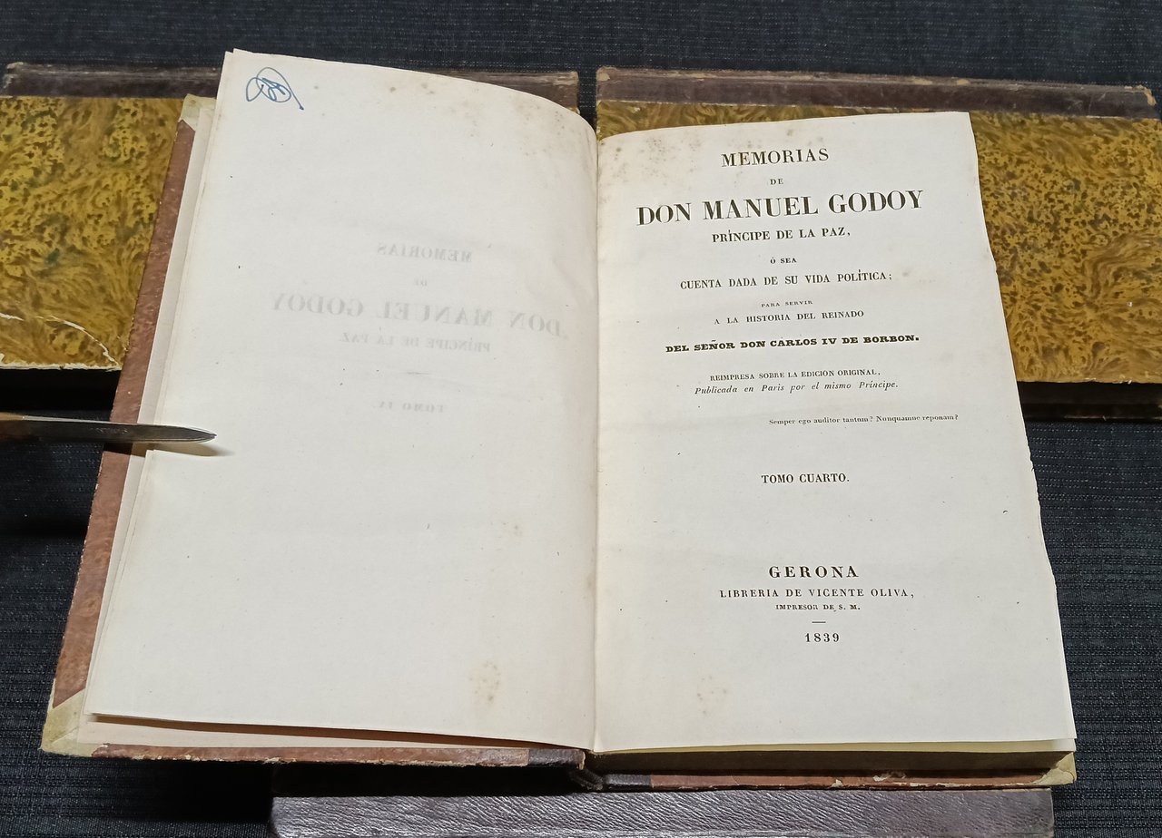Memorias de Don Manuel Godoy, Príncipe de la Paz, ó sea, Cuenta dada de su vida política para servir a la historia del reinado del Señor Don Carlos IV de Borbón. Reimpresa sobre la edición original, publicada en Paris por el mismo Príncipe. Tomos Primero, Segundo, Tercero y Cuarto (de seis). | Libri antichi e moderni | Godoy, Manuel (1767-1851).