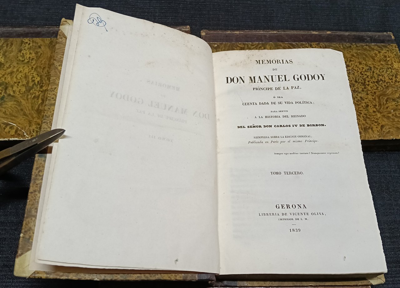 Memorias de Don Manuel Godoy, Príncipe de la Paz, ó sea, Cuenta dada de su vida política para servir a la historia del reinado del Señor Don Carlos IV de Borbón. Reimpresa sobre la edición original, publicada en Paris por el mismo Príncipe. Tomos Primero, Segundo, Tercero y Cuarto (de seis).